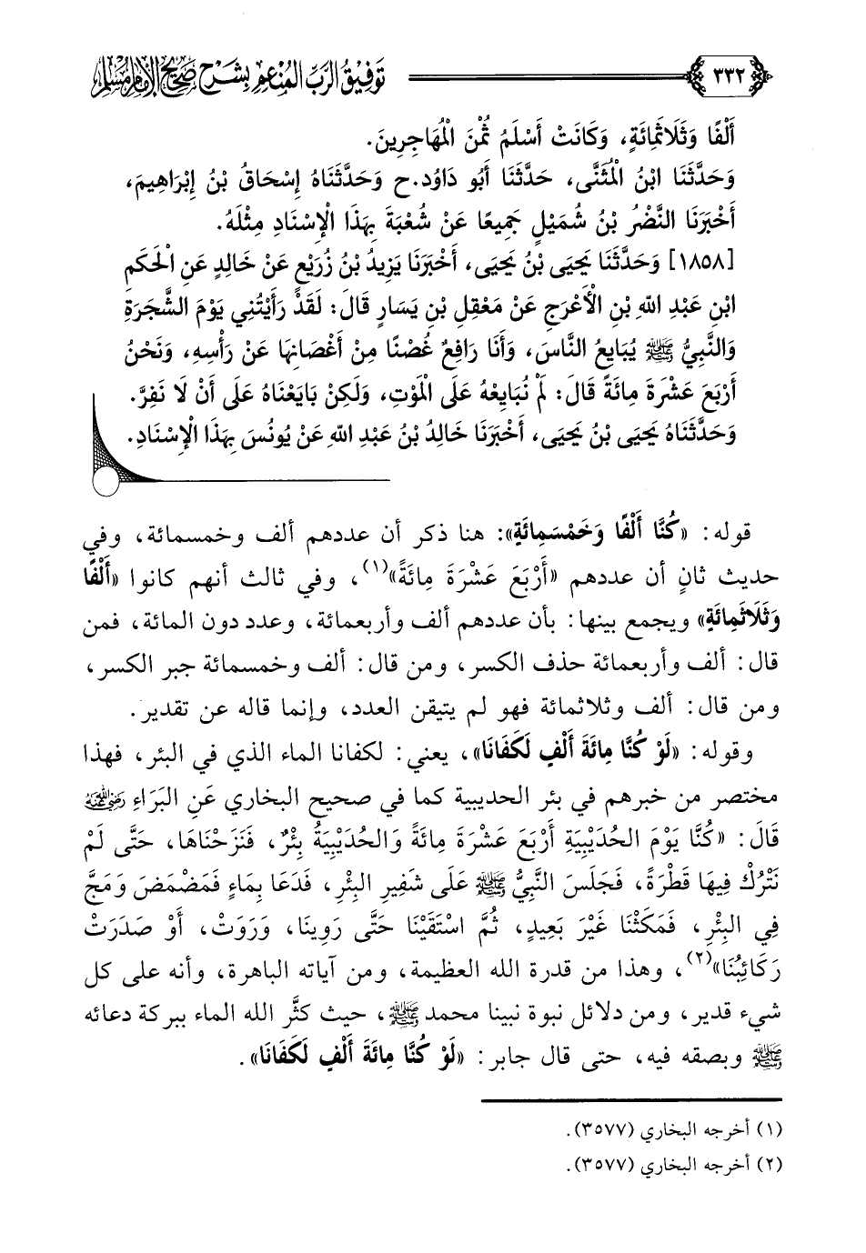 وقوله: ((لَوْ كُنَّا مِائَةَ أَلْفٍ لَكَفَانَا))، يعني: لكفانا الماء الذي في البئر، فهذا مختصر من خبرهم في بئر الحديبية كما في صحيح البخاري عَنِ البَرَاءِ رَضِيَ اللهُ عَنْهُ قَالَ: كُنَّا يَوْمَ الحُدَيْبِيَةِ أَرْبَعَ عَشْرَةَ مِائَةً وَالحُدَيْبِيَةُ بِئْرٌ، فَنَزَحْنَاهَا، حَتَّى لَمْ نَتْرُكْ فِيهَا قَطْرَةً، فَجَلَسَ النَّبِيُّ صَلَّى اللهُ عَلَيْهِ وَسَلَّمَ عَلَى شَفِيرِ البِئْرِ «فَدَعَا بِمَاءٍ فَمَضْمَضَ وَمَجَّ فِي البِئْرِ» فَمَكَثْنَا غَيْرَ بَعِيدٍ، ثُمَّ اسْتَقَيْنَا حَتَّى رَوِينَا، وَرَوَتْ، أَوْ صَدَرَتْ رَكَائِبُنَا (¬٢)، وهذا من قدرة الله العظيمة، ومن آياته الباهرة، وأنه على كل شيء قدير، ومن دلائل نبوة نبينا محمد صلى الله عليه وسلم، حيث كثَّر الله الماء ببركة دعائه عليه الصلاة والسلام وبصقه فيه، حتى قال جابر: ((لَوْ كُنَّا مِائَةَ أَلْفٍ لَكَفَانَا)).