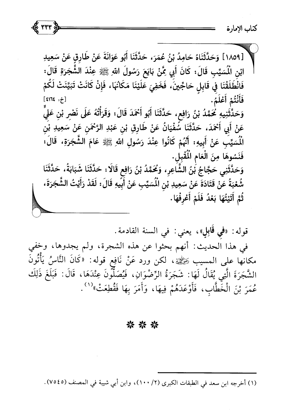 [١٨٥٩] وَحَدَّثَنَاهُ حَامِدُ بْنُ عُمَرَ، حَدَّثَنَا أَبُو عَوَانَةَ عَنْ طَارِقٍ عَنْ سَعِيدِ بْنِ الْمُسَيِّبِ قَالَ: كَانَ أَبِي مِمَّنْ بَايَعَ رَسُولَ اللهِ صلى الله عليه وسلم عِنْدَ الشَّجَرَةِ قَالَ: فَانْطَلَقْنَا فِي قَابِلٍ حَاجِّينَ، فَخَفِيَ عَلَيْنَا مَكَانُهَا، فَإِنْ كَانَتْ تَبَيَّنَتْ لَكُمْ فَأَنْتُمْ أَعْلَمُ.