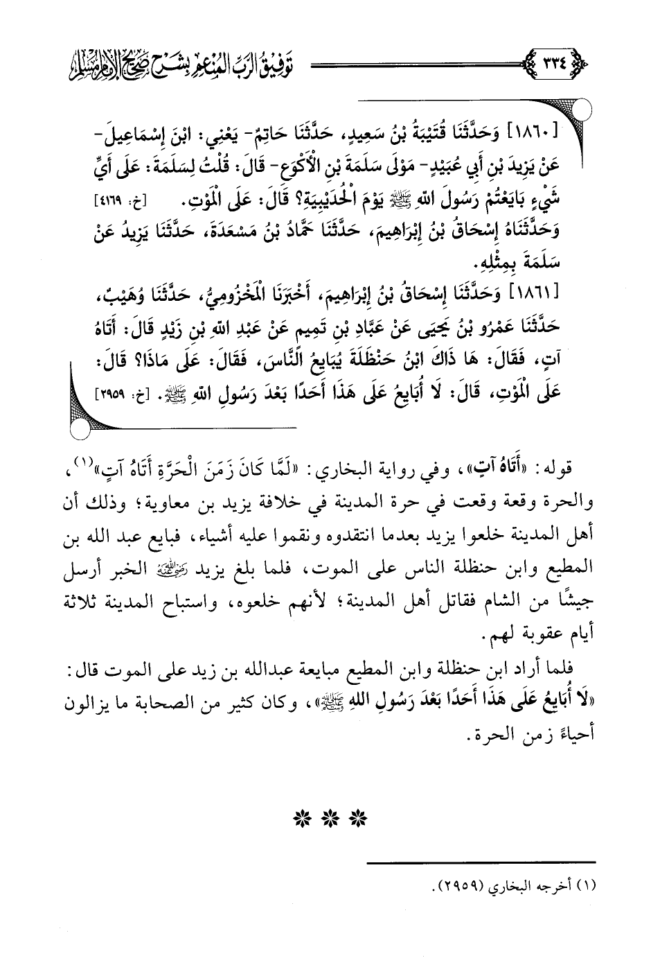 [١٨٦١] وَحَدَّثَنَا إِسْحَاقُ بْنُ إِبْرَاهِيمَ، أَخْبَرَنَا الْمَخْزُومِيُّ، حَدَّثَنَا وُهَيْبٌ، حَدَّثَنَا عَمْرُو بْنُ يَحيَى عَنْ عَبَّادِ بْنِ تَمِيمٍ عَنْ عَبْدِ اللهِ بْنِ زَيْدٍ قَالَ: أَتَاهُ آتٍ، فَقَالَ: هَا ذَاكَ ابْنُ حَنْظَلَةَ يُبَايِعُ النَّاسَ، فَقَالَ: عَلَى مَاذَا؟ قَالَ: عَلَى الْمَوْتِ، قَالَ: لَا أُبَايِعُ عَلَى هَذَا أَحَدًا بَعْدَ رَسُولِ اللهِ صلى الله عليه وسلم.