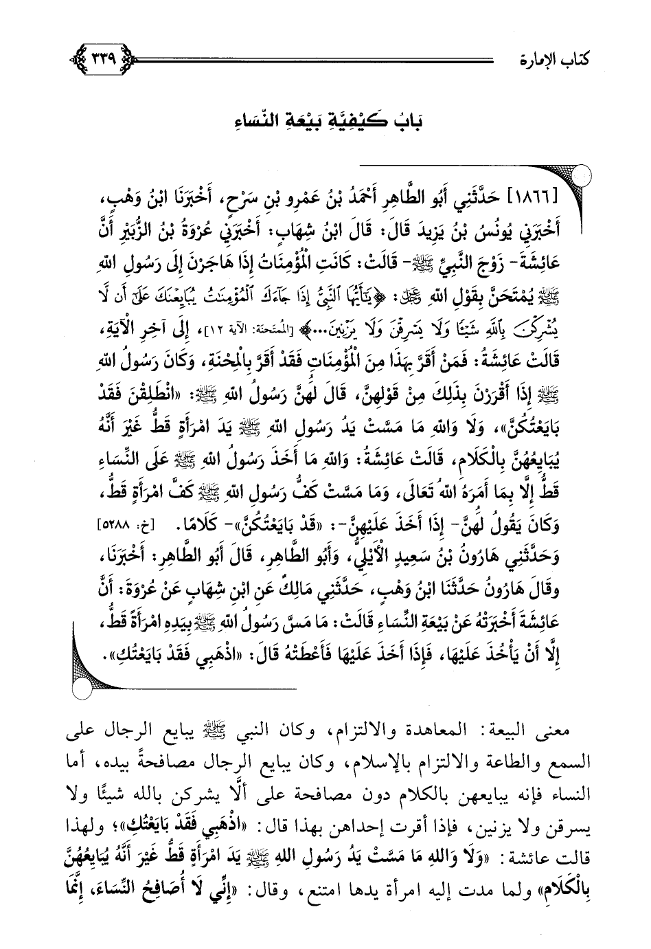 [١٨٦٦] حَدَّثَنِي أَبُو الطَّاهِرِ أَحْمَدُ بْنُ عَمْرِو بْنِ سَرْحٍ، أَخْبَرَنَا ابْنُ وَهْبٍ، أَخْبَرَنِي يُونُسُ بْنُ يَزِيدَ قَالَ: قَالَ ابْنُ شِهَابٍ: أَخْبَرَنِي عُرْوَةُ بْنُ الزُّبَيْرِ أَنَّ عَائِشَةَ- زَوْجَ النَّبِيِّ صلى الله عليه وسلم- قَالَتْ: كَانَتِ الْمُؤْمِنَاتُ إِذَا هَاجَرْنَ إِلَى رَسُولِ اللهِ صلى الله عليه وسلم يُمْتَحَنَّ بِقَوْلِ اللهِ عز وجل: {يَأَيُّهَا النَّبِيُّ إِذَا جَاءَكَ الْمُؤْمِنَاتُ يُبَايِعْنَكَ عَلَى أَنْ لا يُشْرِكْنَ بِاللهِ شَيْئًا وَلا يَسْرِقْنَ وَلا يَزْنِينَ ... }، إِلَى آخِرِ الْآيَةِ، قَالَتْ عَائِشَةُ: فَمَنْ أَقَرَّ بِهَذَا مِنَ الْمُؤْمِنَاتِ فَقَدْ أَقَرَّ بِالْمِحْنَةِ، وَكَانَ رَسُولُ اللهِ صلى الله عليه وسلم إِذَا أَقْرَرْنَ بِذَلِكَ مِنْ قَوْلِهِنَّ، قَالَ لَهُنَّ رَسُولُ اللهِ صلى الله عليه وسلم: ((انْطَلِقْنَ فَقَدْ بَايَعْتُكُنَّ))، وَلَا وَاللهِ مَا مَسَّتْ يَدُ رَسُولِ اللهِ صلى الله عليه وسلم يَدَ امْرَأَةٍ قَطُّ غَيْرَ أَنَّهُ يُبَايِعُهُنَّ بِالْكَلَامِ، قَالَتْ عَائِشَةُ: وَاللهِ مَا أَخَذَ رَسُولُ اللهِ صلى الله عليه وسلم عَلَى النِّسَاءِ قَطُّ إِلَّا بِمَا أَمَرَهُ اللهُ تَعَالَى، وَمَا مَسَّتْ كَفُّ رَسُولِ اللهِ صلى الله عليه وسلم كَفَّ امْرَأَةٍ قَطُّ، وَكَانَ يَقُولُ لَهُنَّ- إِذَا أَخَذَ عَلَيْهِنَّ-: ((قَدْ بَايَعْتُكُنَّ)) - كَلَامًا.