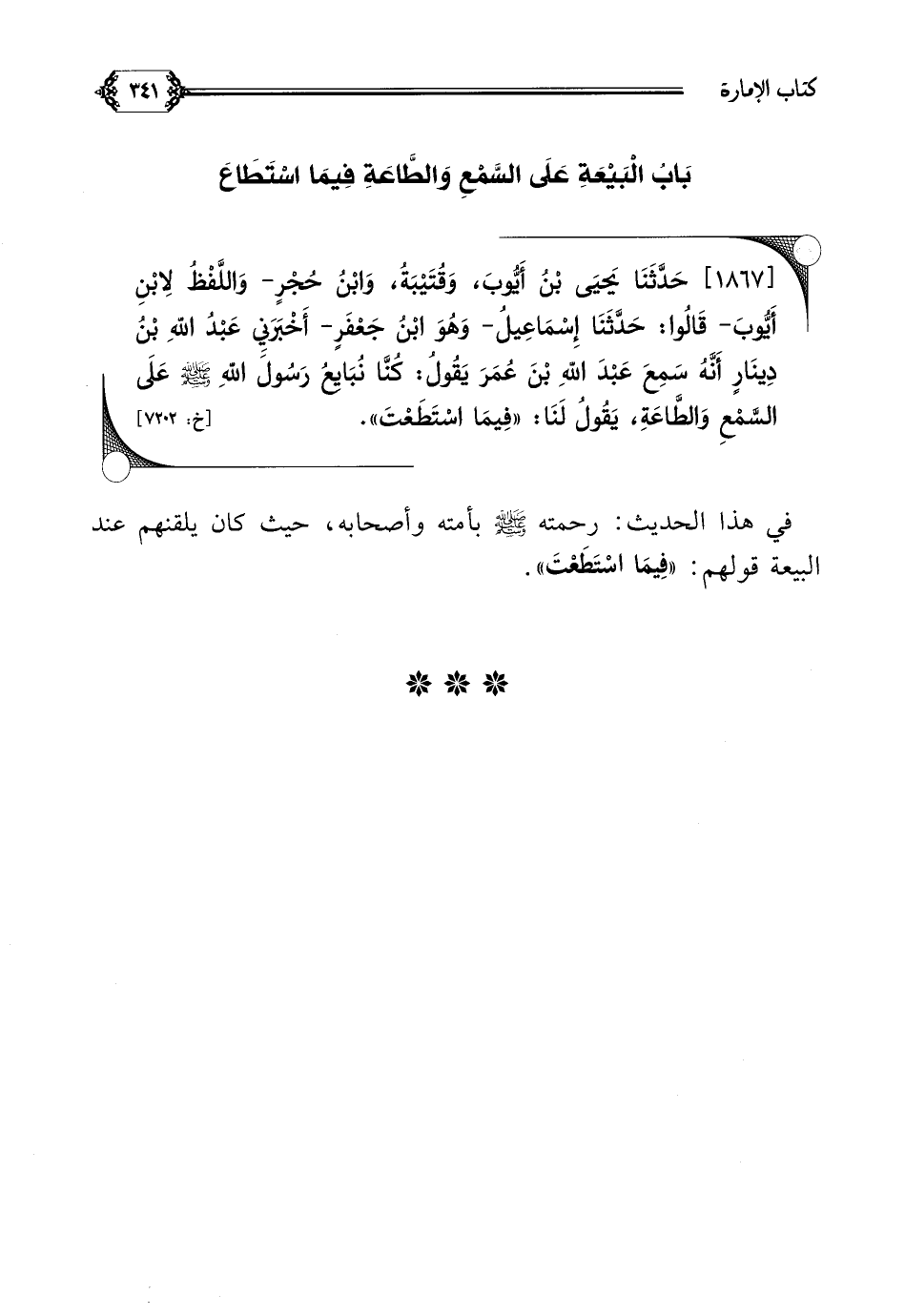 [١٨٦٧] حَدَّثَنَا يَحيَى بْنُ أَيُّوبَ، وَقُتَيْبَةُ، وَابْنُ حُجْرٍ- وَاللَّفْظُ لِابْنِ أَيُّوبَ- قَالُوا: حَدَّثَنَا إِسْمَاعِيلُ- وَهُوَ ابْنُ جَعْفَرٍ- أَخْبَرَنِي عَبْدُ اللهِ بْنُ دِينَارٍ أَنَّهُ سَمِعَ عَبْدَ اللهِ بْنَ عُمَرَ يَقُولُ: كُنَّا نُبَايِعُ رَسُولَ اللهِ صلى الله عليه وسلم عَلَى السَّمْعِ وَالطَّاعَةِ، يَقُولُ لَنَا: ((فِيمَا اسْتَطَعْتَ)).