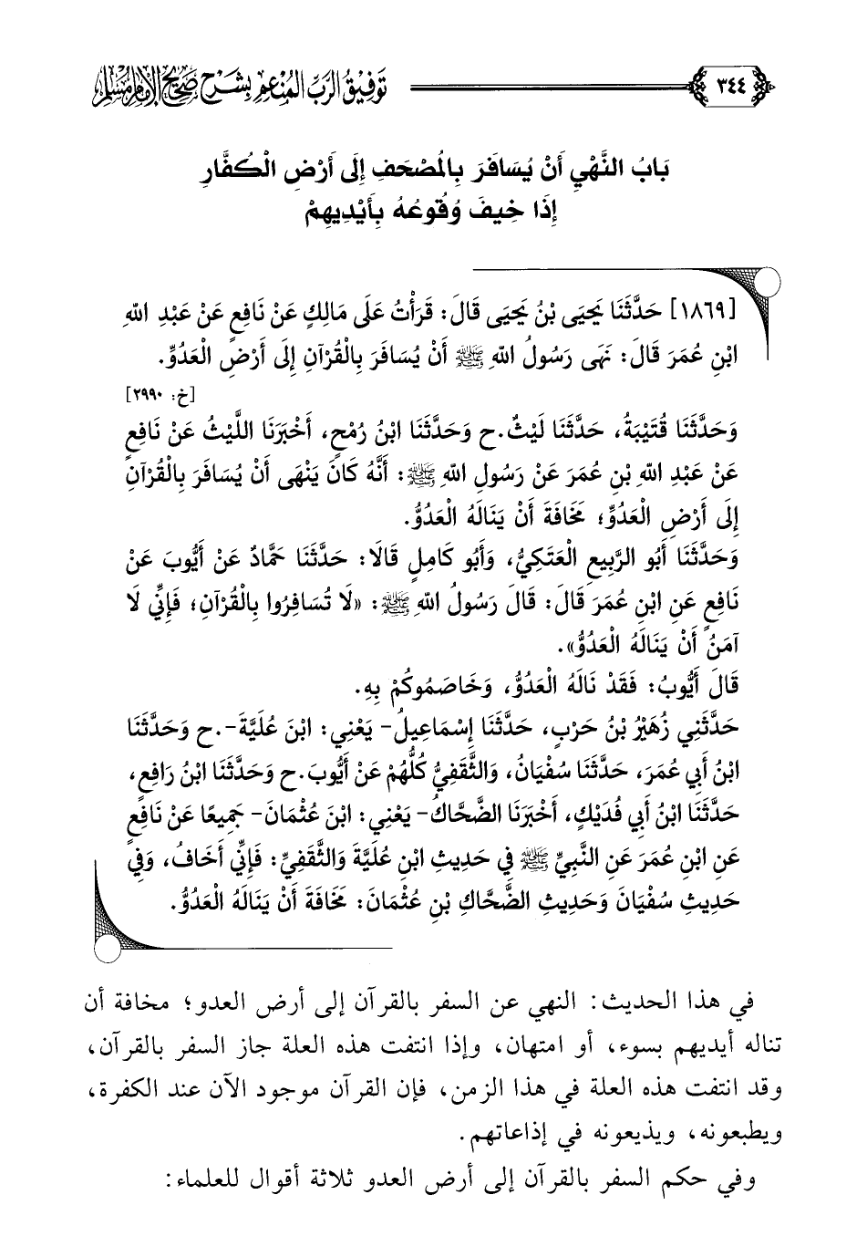 [١٨٦٩] حَدَّثَنَا يَحيَى بْنُ يَحيَى قَالَ: قَرَأْتُ عَلَى مَالِكٍ عَنْ نَافِعٍ عَنْ عَبْدِ اللهِ بْنِ عُمَرَ قَالَ: نَهَى رَسُولُ اللهِ صلى الله عليه وسلم أَنْ يُسَافَرَ بِالْقُرْآنِ إِلَى أَرْضِ الْعَدُوِّ.