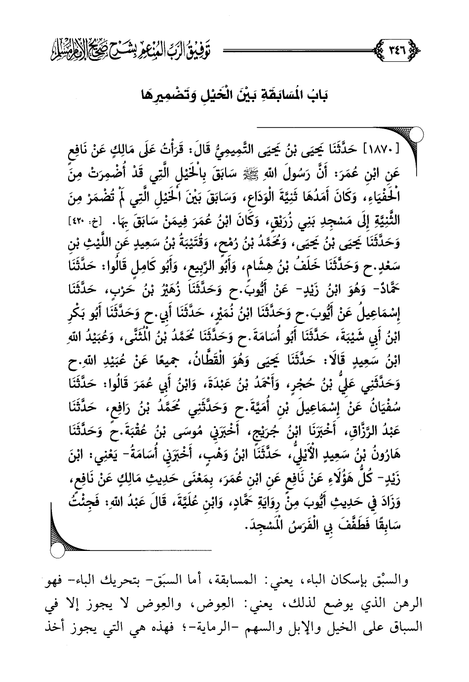 [١٨٧٠] حَدَّثَنَا يَحيَى بْنُ يَحيَى التَّمِيمِيُّ قَالَ: قَرَأْتُ عَلَى مَالِكٍ عَنْ نَافِعٍ عَنِ ابْنِ عُمَرَ: أَنَّ رَسُولَ اللهِ صلى الله عليه وسلم سَابَقَ بِالْخَيْلِ الَّتِي قَدْ أُضْمِرَتْ مِنَ الْحَفْيَاءِ، وَكَانَ أَمَدُهَا ثَنِيَّةَ الْوَدَاعِ، وَسَابَقَ بَيْنَ الْخَيْلِ الَّتِي لَمْ تُضْمَرْ مِنَ الثَّنِيَّةِ إِلَى مَسْجِدِ بَنِي زُرَيْقٍ، وَكَانَ ابْنُ عُمَرَ فِيمَنْ سَابَقَ بِهَا.