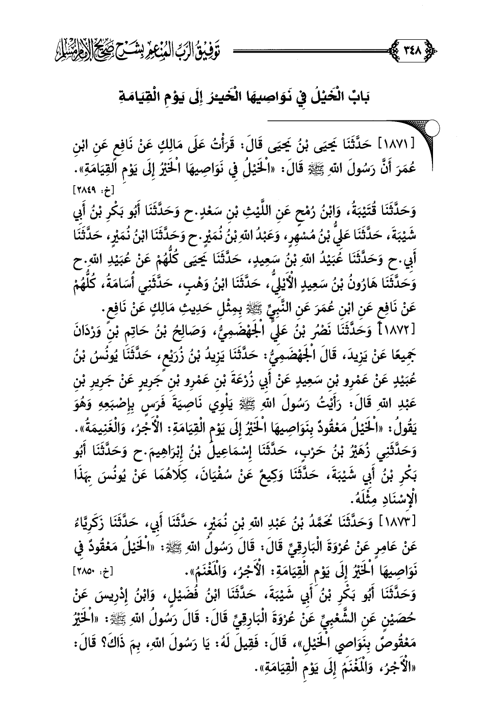 [١٨٧١] حَدَّثَنَا يَحيَى بْنُ يَحيَى قَالَ: قَرَأْتُ عَلَى مَالِكٍ عَنْ نَافِعٍ عَنِ ابْنِ عُمَرَ أَنَّ رَسُولَ اللهِ صلى الله عليه وسلم قَالَ: ((الْخَيْلُ فِي نَوَاصِيهَا الْخَيْرُ إِلَى يَوْمِ الْقِيَامَةِ)).