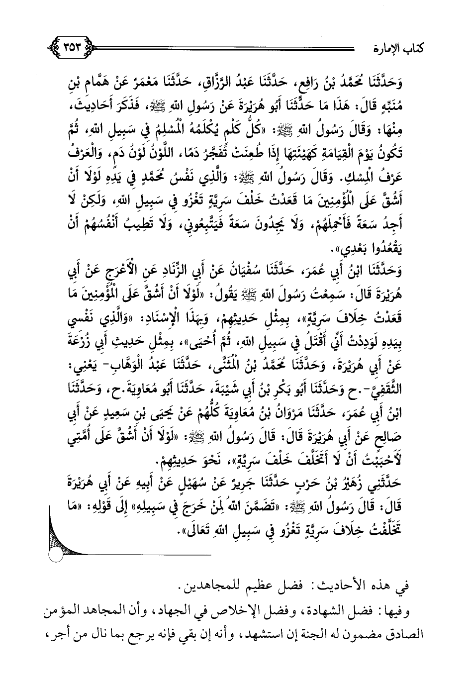 وَحَدَّثَنَا مُحَمَّدُ بْنُ رَافِعٍ، حَدَّثَنَا عَبْدُ الرَّزَّاقِ، حَدَّثَنَا مَعْمَرٌ عَنْ هَمَّامِ بْنِ مُنَبِّهٍ قَالَ: هَذَا مَا حَدَّثَنَا أَبُو هُرَيْرَةَ عَنْ رَسُولِ اللهِ صلى الله عليه وسلم، فَذَكَرَ أَحَادِيثَ، مِنْهَا: وَقَالَ رَسُولُ اللهِ صلى الله عليه وسلم: ((كُلُّ كَلْمٍ يُكْلَمُهُ الْمُسْلِمُ فِي سَبِيلِ اللهِ، ثُمَّ تَكُونُ يَوْمَ الْقِيَامَةِ كَهَيْئَتِهَا إِذَا طُعِنَتْ تَفَجَّرُ دَمًا، اللَّوْنُ لَوْنُ دَمٍ، وَالْعَرْفُ عَرْفُ الْمِسْكِ. وَقَالَ رَسُولُ اللهِ صلى الله عليه وسلم: وَالَّذِي نَفْسُ مُحَمَّدٍ فِي يَدِهِ لَوْلَا أَنْ أَشُقَّ عَلَى الْمُؤْمِنِينَ مَا قَعَدْتُ خَلْفَ سَرِيَّةٍ تَغْزُو فِي سَبِيلِ اللهِ، وَلَكِنْ لَا أَجِدُ سَعَةً فَأَحْمِلَهُمْ، وَلَا يَجِدُونَ سَعَةً فَيَتَّبِعُونِي، وَلَا تَطِيبُ أَنْفُسُهُمْ أَنْ يَقْعُدُوا بَعْدِي)).
