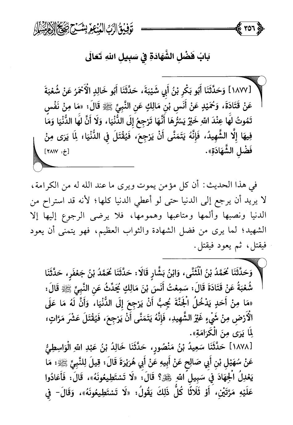[١٨٧٧] وَحَدَّثَنَا أَبُو بَكْرِ بْنُ أَبِي شَيْبَةَ، حَدَّثَنَا أَبُو خَالِدٍ الْأَحْمَرُ عَنْ شُعْبَةَ عَنْ قَتَادَةَ، وَحُمَيْدٍ عَنْ أَنَسِ بْنِ مَالِكٍ عَنِ النَّبِيِّ صلى الله عليه وسلم قَالَ: ((مَا مِنْ نَفْسٍ تَمُوتُ لَهَا عِنْدَ اللهِ خَيْرٌ يَسُرُّهَا أَنَّهَا تَرْجِعُ إِلَى الدُّنْيَا، وَلَا أَنَّ لَهَا الدُّنْيَا وَمَا فِيهَا إِلَّا الشَّهِيدُ، فَإِنَّهُ يَتَمَنَّى أَنْ يَرْجِعَ، فَيُقْتَلَ فِي الدُّنْيَا؛ لِمَا يَرَى مِنْ فَضْلِ الشَّهَادَةِ)).