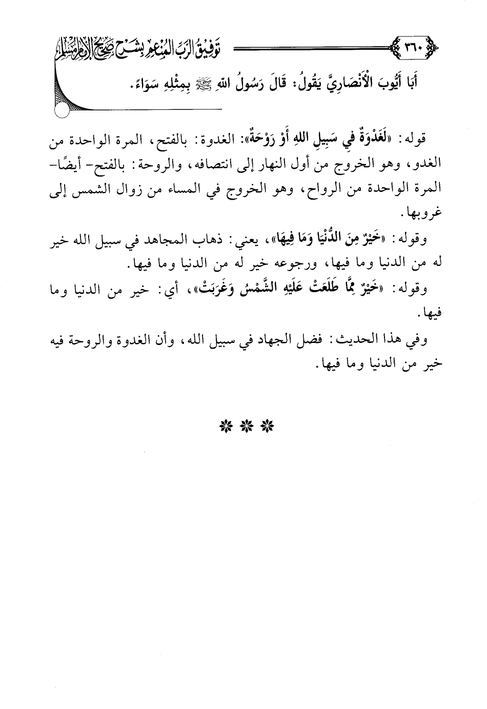 قوله: ((لَغَدْوَةٌ فِي سَبِيلِ اللهِ أَوْ رَوْحَةٌ)) الغدوة: بالفتح، المرة الواحدة من الغدو، وهو الخروج من أول النهار إلى انتصافه، والروحة: بالفتح- أيضًا- المرة الواحدة من الرواح، وهو الخروج في المساء من زوال الشمس إلى غروبها.