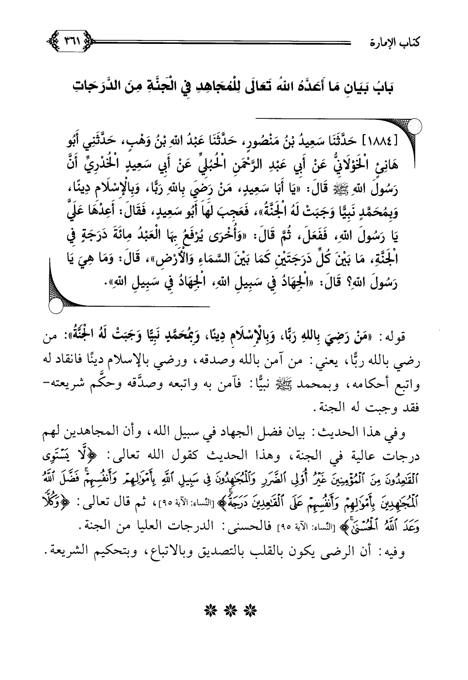 [١٨٨٤] حَدَّثَنَا سَعِيدُ بْنُ مَنْصُورٍ، حَدَّثَنَا عَبْدُ اللهِ بْنُ وَهْبٍ، حَدَّثَنِي أَبُو هَانِئٍ الْخَوْلَانِيُّ عَنْ أَبِي عَبْدِ الرَّحْمَنِ الْحُبُلِيِّ عَنْ أَبِي سَعِيدٍ الْخُدْرِيِّ أَنَّ رَسُولَ اللهِ صلى الله عليه وسلم قَالَ: ((يَا أَبَا سَعِيدٍ، مَنْ رَضِيَ بِاللهِ رَبًّا، وَبِالْإِسْلَامِ دِينًا، وَبِمُحَمَّدٍ نَبِيًّا وَجَبَتْ لَهُ الْجَنَّةُ))، فَعَجِبَ لَهَا أَبُو سَعِيدٍ، فَقَالَ: أَعِدْهَا عَلَيَّ يَا رَسُولَ اللهِ، فَفَعَلَ، ثُمَّ قَالَ: ((وَأُخْرَى يُرْفَعُ بِهَا الْعَبْدُ مِائَةَ دَرَجَةٍ فِي الْجَنَّةِ، مَا بَيْنَ كُلِّ دَرَجَتَيْنِ كَمَا بَيْنَ السَّمَاءِ وَالْأَرْضِ))، قَالَ: وَمَا هِيَ يَا رَسُولَ اللهِ؟ قَالَ: ((الْجِهَادُ فِي سَبِيلِ اللهِ، الْجِهَادُ فِي سَبِيلِ اللهِ)).