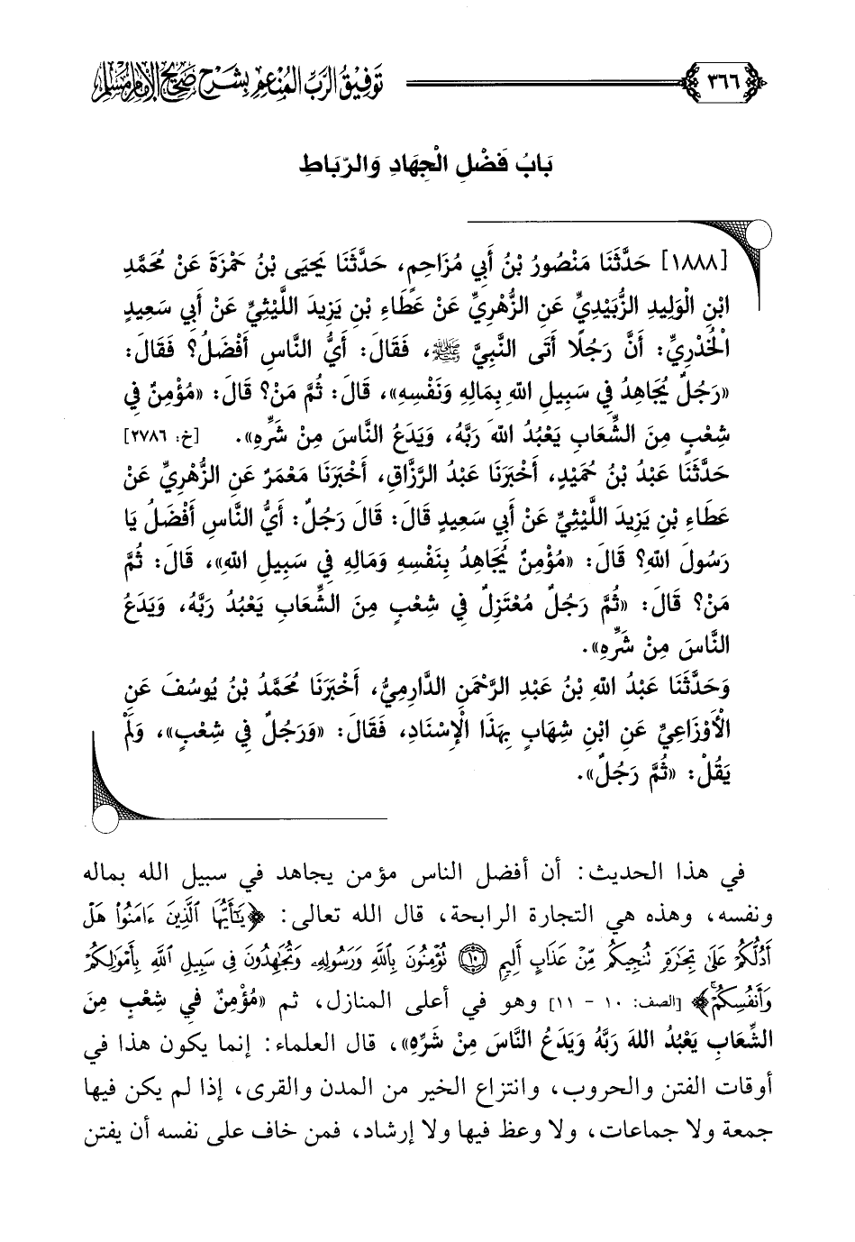 [١٨٨٨] حَدَّثَنَا مَنْصُورُ بْنُ أَبِي مُزَاحِمٍ، حَدَّثَنَا يَحيَى بْنُ حَمْزَةَ عَنْ مُحَمَّدِ بْنِ الْوَلِيدِ الزُّبَيْدِيِّ عَنِ الزُّهْرِيِّ عَنْ عَطَاءِ بْنِ يَزِيدَ اللَّيْثِيِّ عَنْ أَبِي سَعِيدٍ الْخُدْرِيِّ: أَنَّ رَجُلًا أَتَى النَّبِيَّ صلى الله عليه وسلم، فَقَالَ: أَيُّ النَّاسِ أَفْضَلُ؟ فَقَالَ: ((رَجُلٌ يُجَاهِدُ فِي سَبِيلِ اللهِ بِمَالِهِ وَنَفْسِهِ))، قَالَ: ثُمَّ مَنْ؟ قَالَ: ((مُؤْمِنٌ فِي شِعْبٍ مِنَ الشِّعَابِ يَعْبُدُ اللهَ رَبَّهُ، وَيَدَعُ النَّاسَ مِنْ شَرِّهِ)).