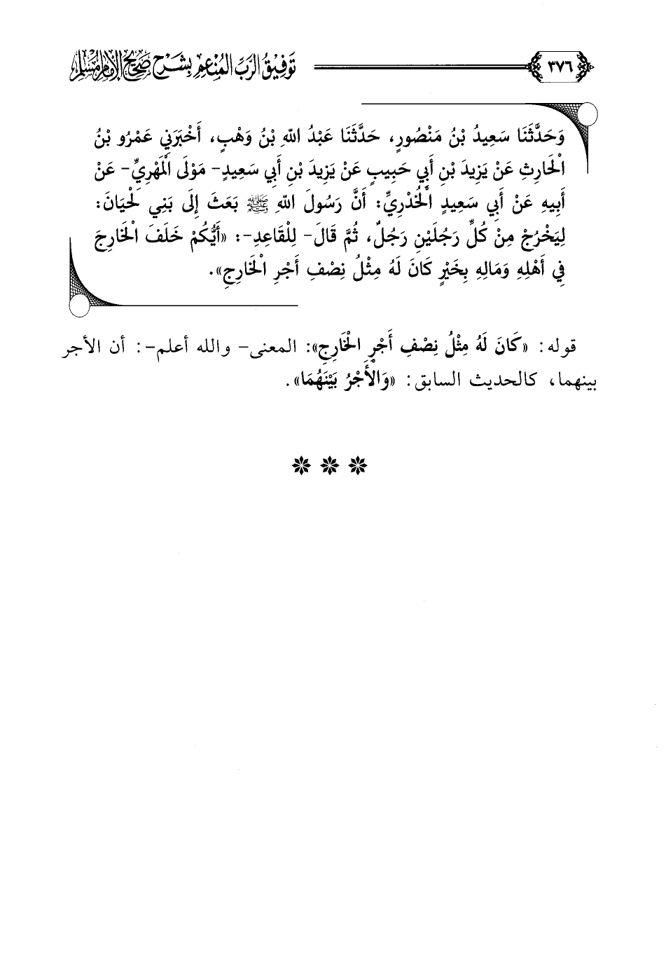 وَحَدَّثَنَا سَعِيدُ بْنُ مَنْصُورٍ، حَدَّثَنَا عَبْدُ اللهِ بْنُ وَهْبٍ، أَخْبَرَنِي عَمْرُو بْنُ الْحَارِثِ عَنْ يَزِيدَ بْنِ أَبِي حَبِيبٍ عَنْ يَزِيدَ بْنِ أَبِي سَعِيدٍ- مَوْلَى الْمَهْرِيِّ- عَنْ أَبِيهِ عَنْ أَبِي سَعِيدٍ الْخُدْرِيِّ: أَنَّ رَسُولَ اللهِ صلى الله عليه وسلم بَعَثَ إِلَى بَنِي لَحْيَانَ: لِيَخْرُجْ مِنْ كُلِّ رَجُلَيْنِ رَجُلٌ، ثُمَّ قَالَ- لِلْقَاعِدِ-: ((أَيُّكُمْ خَلَفَ الْخَارِجَ فِي أَهْلِهِ وَمَالِهِ بِخَيْرٍ كَانَ لَهُ مِثْلُ نِصْفِ أَجْرِ الْخَارِجِ)).