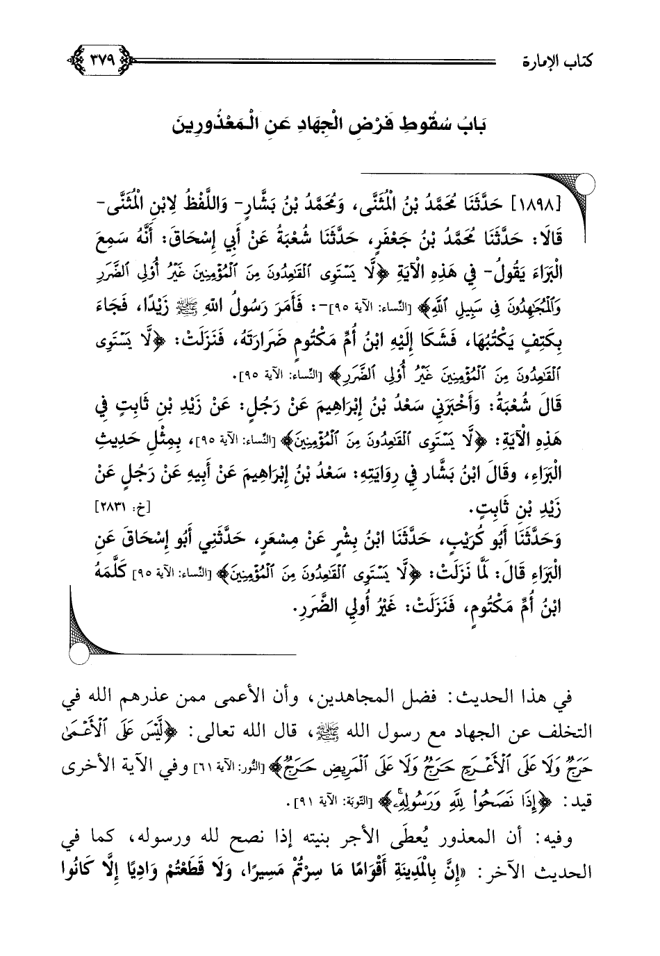 [١٨٩٨] حَدَّثَنَا مُحَمَّدُ بْنُ الْمُثَنَّى، وَمُحَمَّدُ بْنُ بَشَّارٍ- وَاللَّفْظُ لِابْنِ الْمُثَنَّى- قَالَا: حَدَّثَنَا مُحَمَّدُ بْنُ جَعْفَرٍ، حَدَّثَنَا شُعْبَةُ عَنْ أَبِي إِسْحَاقَ: أَنَّهُ سَمِعَ الْبَرَاءَ يَقُولُ- فِي هَذِهِ الْآيَةِ {لا يَسْتَوِي الْقَاعِدُونَ مِنَ الْمُؤْمِنِينَ وَالْمُجَاهِدُونَ فِي سَبِيلِ اللهِ} -: فَأَمَرَ رَسُولُ اللهِ صلى الله عليه وسلم زَيْدًا، فَجَاءَ بِكَتِفٍ يَكْتُبُهَا، فَشَكَا إِلَيْهِ ابْنُ أُمِّ مَكْتُومٍ ضَرَارَتَهُ، فَنَزَلَتْ: {لا يَسْتَوِي الْقَاعِدُونَ مِنَ الْمُؤْمِنِينَ غَيْرُ أُولِي الضَّرَرِ}.