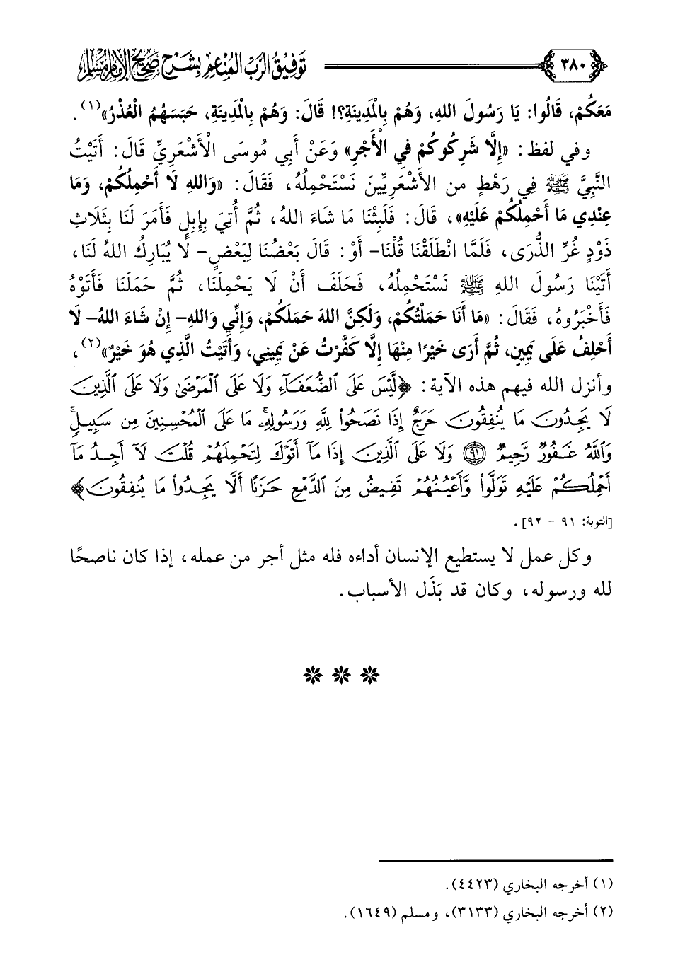 وفي لفظ: ((إِلَّا شَرِكُوكُمْ فِي الْأَجْرِ)) وَعَنْ أَبِي مُوسَى الْأَشْعَرِيِّ قَالَ: أَتَيْتُ النَّبِيَّ صلى الله عليه وسلم فِي رَهْطٍ من الأَشْعَرِيِّينَ نَسْتَحْمِلُهُ، فَقَالَ: ((وَاللهِ لَا أَحْمِلُكُمْ، وَمَا عِنْدِي مَا أَحْمِلُكُمْ عَلَيْهِ، قَالَ: فَلَبِثْنَا مَا شَاءَ اللهُ، ثُمَّ أُتِيَ بِإِبِلٍ فَأَمَرَ لَنَا بِثَلَاثِ ذَوْدٍ غُرِّ الذُّرَى، فَلَمَّا انْطَلَقْنَا قُلْنَا- أَوْ: قَالَ بَعْضُنَا لِبَعْضٍ- لَا يُبَارِكُ اللهُ لَنَا، أَتَيْنَا رَسُولَ اللهِ صلى الله عليه وسلم نَسْتَحْمِلُهُ، فَحَلَفَ أَنْ لَا يَحْمِلَنَا، ثُمَّ حَمَلَنَا فَأَتَوْهُ فَأَخْبَرُوهُ، فَقَالَ: مَا أَنَا حَمَلْتُكُمْ، وَلَكِنَّ اللهَ حَمَلَكُمْ، وَإِنِّي وَاللهِ إِنْ شَاءَ اللهُ لَا أَحْلِفُ عَلَى يَمِينٍ، ثُمَّ أَرَى خَيْرًا مِنْهَا إِلَّا كَفَّرْتُ عَنْ يَمِينِي، وَأَتَيْتُ الَّذِي هُوَ خَيْرٌ)) (¬٢)، وأنزل الله فيهم هذه الآية: {لَّيْسَ عَلَى الضُّعَفَاء وَلا عَلَى الْمَرْضَى وَلا عَلَى الَّذِينَ لا يَجِدُونَ مَا يُنفِقُونَ حَرَجٌ إِذَا نَصَحُوا لِلّهِ وَرَسُولِهِ مَا عَلَى الْمُحْسِنِينَ مِن سَبِيلٍ وَاللهُ غَفُورٌ رَّحِيمٌ وَلا عَلَى الَّذِينَ إِذَا مَا أَتَوْكَ لِتَحْمِلَهُمْ قُلْتَ لا أَجِدُ مَا أَحْمِلُكُمْ عَلَيْهِ تَوَلَّوا وَّأَعْيُنُهُمْ تَفِيضُ مِنَ الدَّمْعِ حَزَنًا أَلَاّ يَجِدُوا مَا يُنفِقُونَ}.