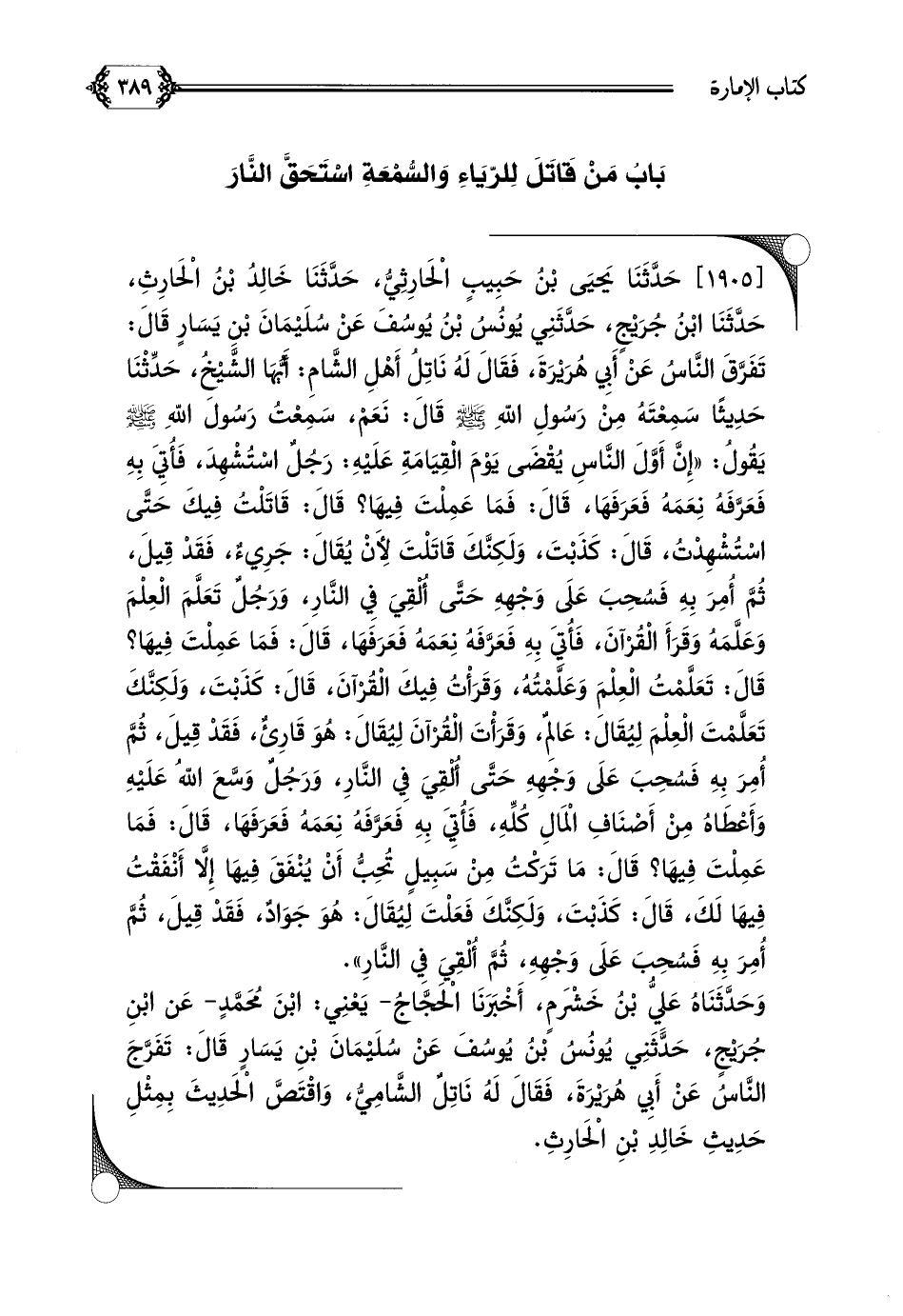 [١٩٠٥] حَدَّثَنَا يَحيَى بْنُ حَبِيبٍ الْحَارِثِيُّ، حَدَّثَنَا خَالِدُ بْنُ الْحَارِثِ، حَدَّثَنَا ابْنُ جُرَيْجٍ، حَدَّثَنِي يُونُسُ بْنُ يُوسُفَ عَنْ سُلَيْمَانَ بْنِ يَسَارٍ قَالَ: تَفَرَّقَ النَّاسُ عَنْ أَبِي هُرَيْرَةَ، فَقَالَ لَهُ نَاتِلُ أَهْلِ الشَّامِ: أَيُّهَا الشَّيْخُ، حَدِّثْنَا حَدِيثًا سَمِعْتَهُ مِنْ رَسُولِ اللهِ صلى الله عليه وسلم قَالَ: نَعَمْ، سَمِعْتُ رَسُولَ اللهِ صلى الله عليه وسلم يَقُولُ: ((إِنَّ أَوَّلَ النَّاسِ يُقْضَى يَوْمَ الْقِيَامَةِ عَلَيْهِ: رَجُلٌ اسْتُشْهِدَ، فَأُتِيَ بِهِ فَعَرَّفَهُ نِعَمَهُ فَعَرَفَهَا، قَالَ: فَمَا عَمِلْتَ فِيهَا؟ قَالَ: قَاتَلْتُ فِيكَ حَتَّى اسْتُشْهِدْتُ، قَالَ: كَذَبْتَ، وَلَكِنَّكَ قَاتَلْتَ لِأَنْ يُقَالَ: جَرِيءٌ، فَقَدْ قِيلَ، ثُمَّ أُمِرَ بِهِ فَسُحِبَ عَلَى وَجْهِهِ حَتَّى أُلْقِيَ فِي النَّارِ، وَرَجُلٌ تَعَلَّمَ الْعِلْمَ وَعَلَّمَهُ وَقَرَأَ الْقُرْآنَ، فَأُتِيَ بِهِ فَعَرَّفَهُ نِعَمَهُ فَعَرَفَهَا، قَالَ: فَمَا عَمِلْتَ فِيهَا؟ قَالَ: تَعَلَّمْتُ الْعِلْمَ وَعَلَّمْتُهُ، وَقَرَأْتُ فِيكَ الْقُرْآنَ، قَالَ: كَذَبْتَ، وَلَكِنَّكَ تَعَلَّمْتَ الْعِلْمَ لِيُقَالَ: عَالِمٌ، وَقَرَأْتَ الْقُرْآنَ لِيُقَالَ: هُوَ قَارِئٌ، فَقَدْ قِيلَ، ثُمَّ أُمِرَ بِهِ فَسُحِبَ عَلَى وَجْهِهِ حَتَّى أُلْقِيَ فِي النَّارِ، وَرَجُلٌ وَسَّعَ اللهُ عَلَيْهِ وَأَعْطَاهُ مِنْ أَصْنَافِ الْمَالِ كُلِّهِ، فَأُتِيَ بِهِ فَعَرَّفَهُ نِعَمَهُ فَعَرَفَهَا، قَالَ: فَمَا عَمِلْتَ فِيهَا؟ قَالَ: مَا تَرَكْتُ مِنْ سَبِيلٍ تُحِبُّ أَنْ يُنْفَقَ فِيهَا إِلَّا أَنْفَقْتُ فِيهَا لَكَ، قَالَ: كَذَبْتَ، وَلَكِنَّكَ فَعَلْتَ لِيُقَالَ: هُوَ جَوَادٌ، فَقَدْ قِيلَ، ثُمَّ أُمِرَ بِهِ فَسُحِبَ عَلَى وَجْهِهِ، ثُمَّ أُلْقِيَ فِي النَّارِ)).