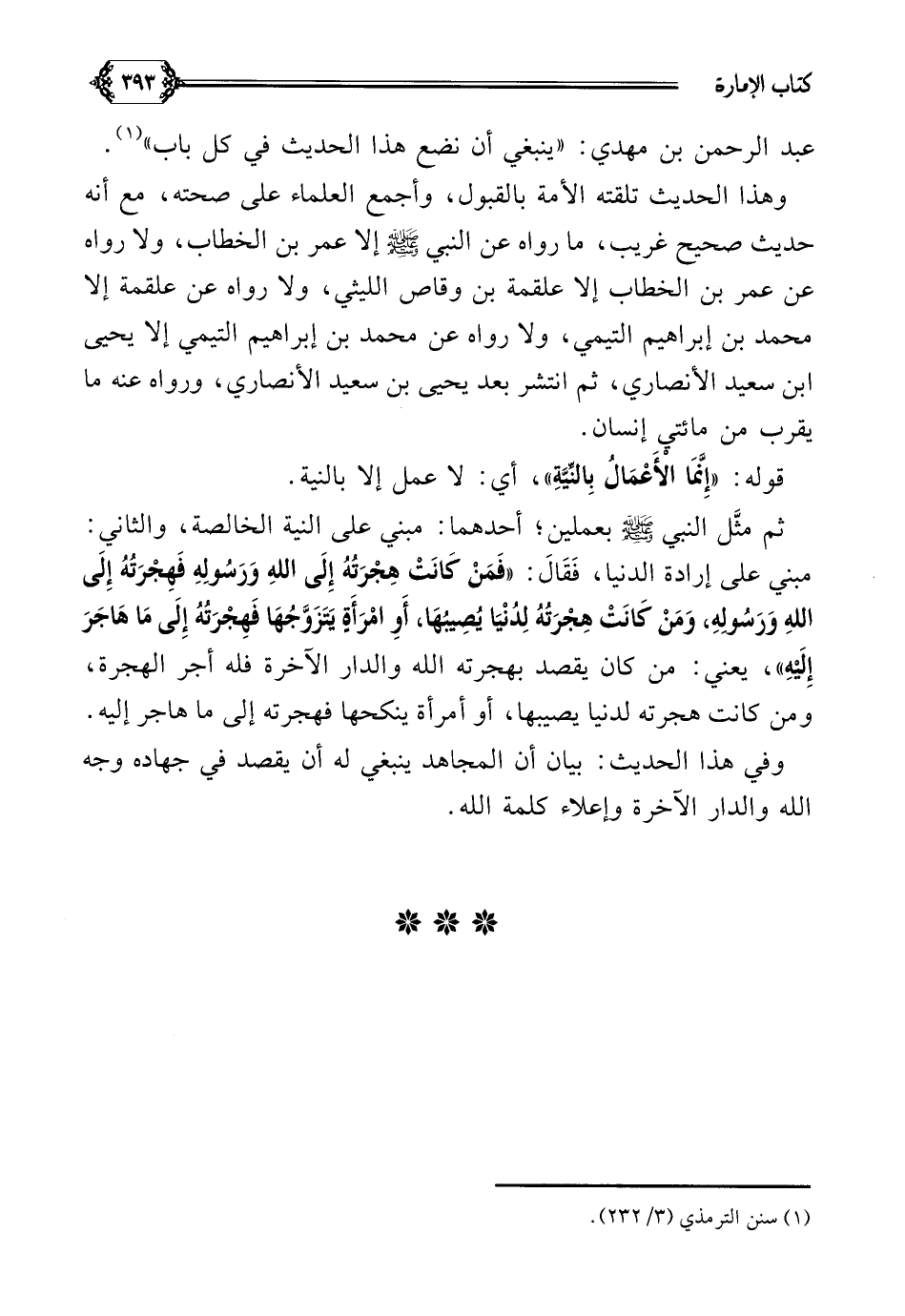 وهذا الحديث تلقته الأمة بالقبول، وأجمع العلماء على صحته، مع أنه حديث صحيح غريب، ما رواه عن النبي صلى الله عليه وسلم إلا عمر بن الخطاب، ولا رواه عن عمر بن الخطاب إلا علقمة بن وقاص الليثي، ولا رواه عن علقمة إلا محمد بن إبراهيم التيمي، ولا رواه عن محمد بن إبراهيم التيمي إلا يحيى بن سعيد الأنصاري، ثم انتشر بعد يحيى بن سعيد الأنصاري، ورواه عنه ما يقرب من مائتي إنسان.