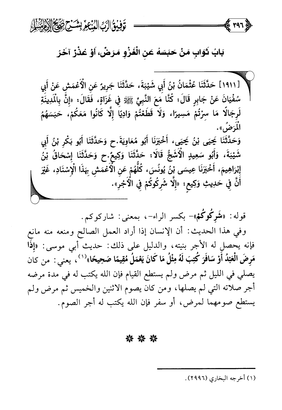 [١٩١١] حَدَّثَنَا عُثْمَانُ بْنُ أَبِي شَيْبَةَ، حَدَّثَنَا جَرِيرٌ عَنِ الْأَعْمَشِ عَنْ أَبِي سُفْيَانَ عَنْ جَابِرٍ قَالَ: كُنَّا مَعَ النَّبِيِّ صلى الله عليه وسلم فِي غَزَاةٍ، فَقَالَ: ((إِنَّ بِالْمَدِينَةِ لَرِجَالًا مَا سِرْتُمْ مَسِيرًا، وَلَا قَطَعْتُمْ وَادِيًا إِلَّا كَانُوا مَعَكُمْ، حَبَسَهُمُ الْمَرَضُ)).