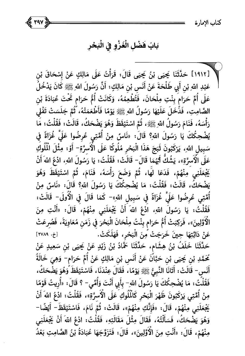 [١٩١٢] حَدَّثَنَا يَحيَى بْنُ يَحيَى قَالَ: قَرَأْتُ عَلَى مَالِكٍ عَنْ إِسْحَاقَ بْنِ عَبْدِ اللهِ بْنِ أَبِي طَلْحَةَ عَنْ أَنَسِ بْنِ مَالِكٍ: أَنَّ رَسُولَ اللهِ صلى الله عليه وسلم كَانَ يَدْخُلُ عَلَى أُمِّ حَرَامٍ بِنْتِ مِلْحَانَ، فَتُطْعِمُهُ، وَكَانَتْ أُمُّ حَرَامٍ تَحْتَ عُبَادَةَ بْنِ الصَّامِتِ، فَدَخَلَ عَلَيْهَا رَسُولُ اللهِ صلى الله عليه وسلم يَوْمًا فَأَطْعَمَتْهُ، ثُمَّ جَلَسَتْ تَفْلِي رَأْسَهُ، فَنَامَ رَسُولُ اللهِ صلى الله عليه وسلم، ثُمَّ اسْتَيْقَظَ وَهُوَ يَضْحَكُ، قَالَتْ: فَقُلْتُ: مَا يُضْحِكُكَ يَا رَسُولَ اللهِ؟ قَالَ: ((نَاسٌ مِنْ أُمَّتِي عُرِضُوا عَلَيَّ غُزَاةً فِي سَبِيلِ اللهِ، يَرْكَبُونَ ثَبَجَ هَذَا الْبَحْرِ مُلُوكًا عَلَى الْأَسِرَّةِ- أَوْ: مِثْلَ الْمُلُوكِ عَلَى الْأَسِرَّةِ))، يَشُكُّ أَيَّهُمَا قَالَ- قَالَتْ: فَقُلْتُ: يَا رَسُولَ اللهِ، ادْعُ اللهَ أَنْ يَجْعَلَنِي مِنْهُمْ، فَدَعَا لَهَا، ثُمَّ وَضَعَ رَأْسَهُ، فَنَامَ، ثُمَّ اسْتَيْقَظَ وَهُوَ يَضْحَكُ، قَالَتْ: فَقُلْتُ: مَا يُضْحِكُكَ يَا رَسُولَ اللهِ؟ قَالَ: ((نَاسٌ مِنْ أُمَّتِي عُرِضُوا عَلَيَّ غُزَاةً فِي سَبِيلِ اللهِ)) - كَمَا قَالَ فِي الْأُولَى- قَالَتْ: فَقُلْتُ: يَا رَسُولَ اللهِ، ادْعُ اللهَ أَنْ يَجْعَلَنِي مِنْهُمْ، قَالَ: ((أَنْتِ مِنَ الْأَوَّلِينَ))، فَرَكِبَتْ أُمُّ حَرَامٍ بِنْتُ مِلْحَانَ الْبَحْرَ فِي زَمَنِ مُعَاوِيَةَ، فَصُرِعَتْ عَنْ دَابَّتِهَا حِينَ خَرَجَتْ مِنَ الْبَحْرِ، فَهَلَكَتْ.