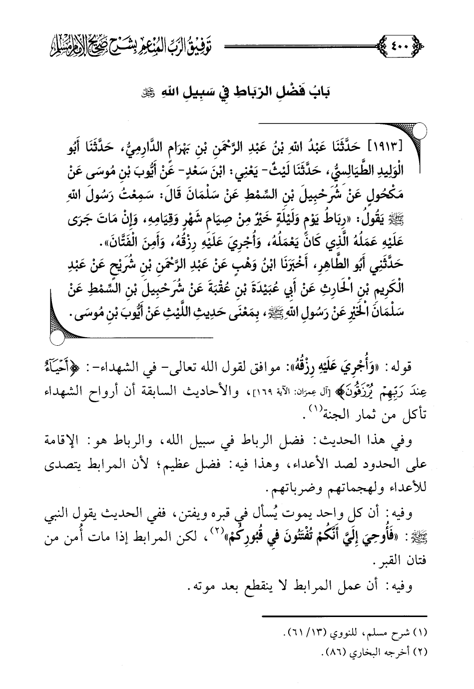 قوله: ((وَأُجْرِيَ عَلَيْهِ رِزْقُهُ)): موافق لقول الله تعالى في الشهداء: {أحياء عند ربهم يرزقون}، والأحاديث السابقة أن أرواح الشهداء تأكل من ثمار الجنة (¬١).