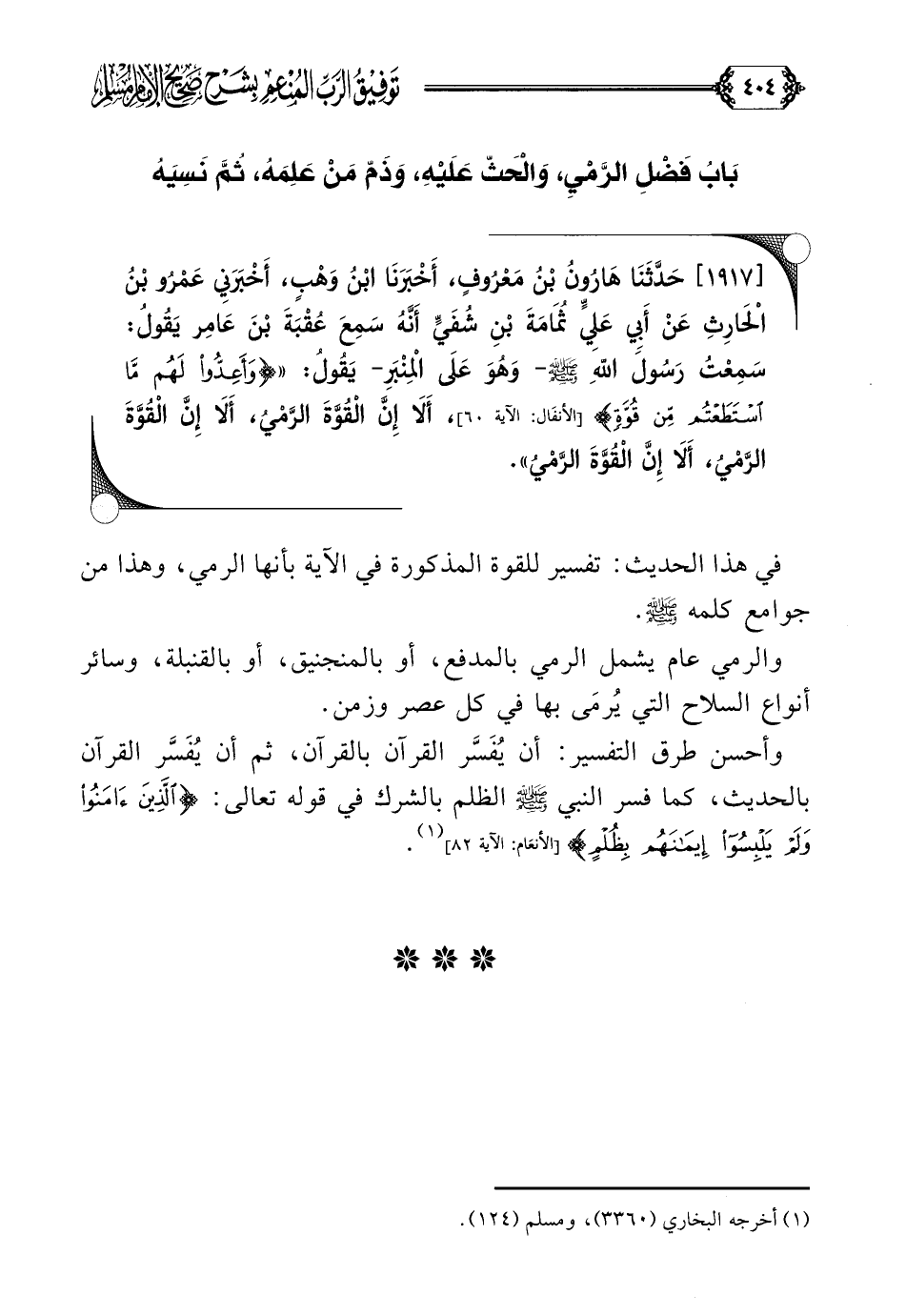 هذا الحديث فيه تفسير للقوة المذكورة في الآية بأنها الرمي، وهذا من جوامع كلمه صلى الله عليه وسلم.