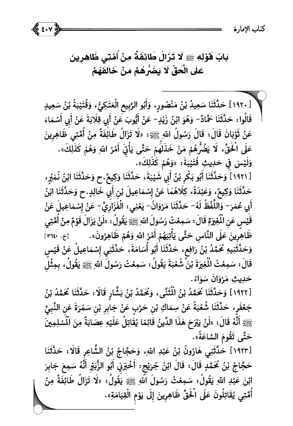 [١٩٢٠] حَدَّثَنَا سَعِيدُ بْنُ مَنْصُورٍ، وَأَبُو الرَّبِيعِ الْعَتَكِيُّ، وَقُتَيْبَةُ بْنُ سَعِيدٍ قَالُوا: حَدَّثَنَا حَمَّادٌ- وَهُوَ ابْنُ زَيْدٍ- عَنْ أَيُّوبَ عَنْ أَبِي قِلَابَةَ عَنْ أَبِي أَسْمَاءَ عَنْ ثَوْبَانَ قَالَ: قَالَ رَسُولُ اللهِ صلى الله عليه وسلم: ((لَا تَزَالُ طَائِفَةٌ مِنْ أُمَّتِي ظَاهِرِينَ عَلَى الْحَقِّ، لَا يَضُرُّهُمْ مَنْ خَذَلَهُمْ حَتَّى يَأْتِيَ أَمْرُ اللهِ وَهُمْ كَذَلِكَ)).