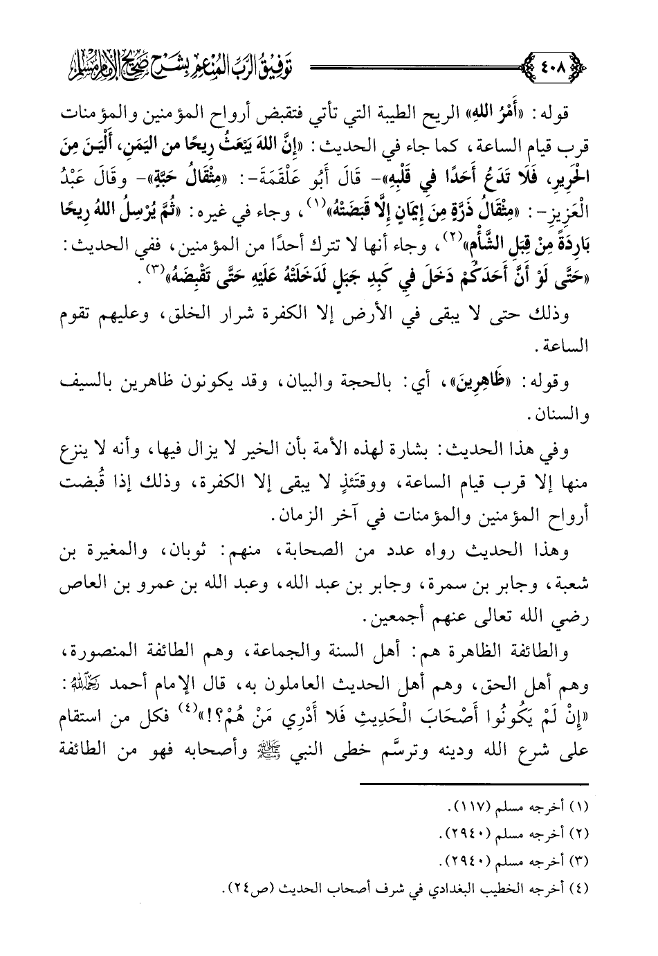 قوله: ((أَمْرُ اللهِ)) الريح الطيبة التي تأتي فتقبض أرواح المؤمنين والمؤمنات قرب قيام الساعة، كما جاء في الحديث: ((إِنَّ اللهَ يَبْعَثُ رِيحًا من اليَمَنِ، أَلْيَنَ مِنَ الْحَرِيرِ، فَلَا تَدَعُ أَحَدًا فِي قَلْبِهِ)) - قَالَ أَبُو عَلْقَمَةَ-: ((مِثْقَالُ حَبَّةٍ)) - وقَالَ عَبْدُ الْعَزِيزِ-: ((مِثْقَالُ ذَرَّةٍ مِنَ إِيمَانٍ إِلَّا قَبَضَتْهُ)) (¬١)، وجاء في غيره: ((ثُمَّ يُرْسِلُ اللهُ رِيحًا بَارِدَةً مِنْ قِبَلِ الشَّأْمِ)) (¬٢)، وجاء أنها لا تترك أحدًا من المؤمنين، ففي الحديث: ((حَتَّى لَوْ أَنَّ أَحَدَكُمْ دَخَلَ فِي كَبِدِ جَبَلٍ لَدَخَلَتْهُ عَلَيْهِ حَتَّى تَقْبِضَهُ)) (¬٣).