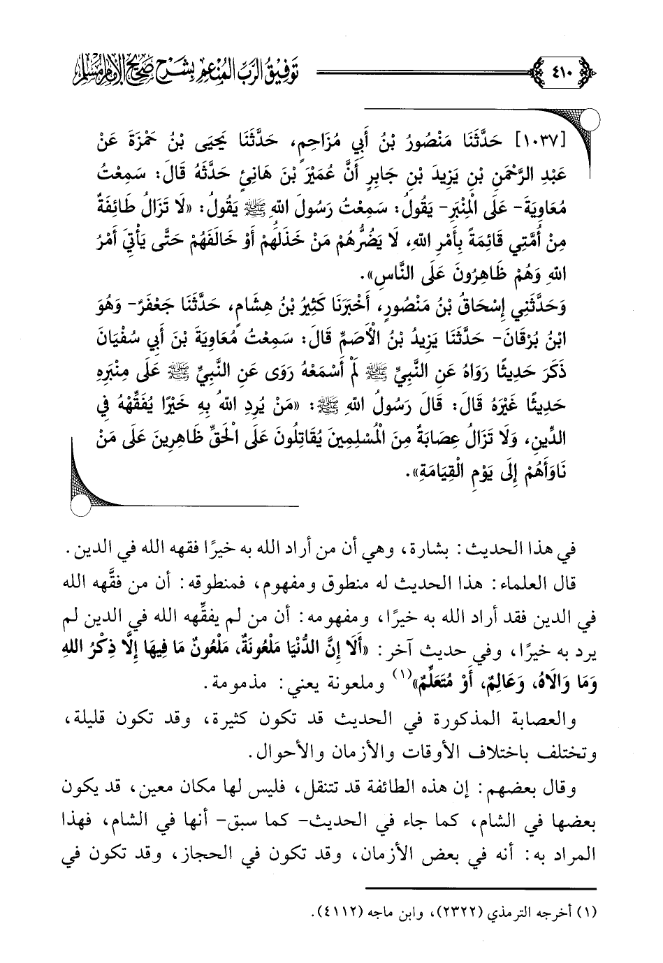 [١٠٣٧] حَدَّثَنَا مَنْصُورُ بْنُ أَبِي مُزَاحِمٍ، حَدَّثَنَا يَحيَى بْنُ حَمْزَةَ عَنْ عَبْدِ الرَّحْمَنِ بْنِ يَزِيدَ بْنِ جَابِرٍ أَنَّ عُمَيْرَ بْنَ هَانِئٍ حَدَّثَهُ قَالَ: سَمِعْتُ مُعَاوِيَةَ عَلَى الْمِنْبَرِ يَقُولُ: سَمِعْتُ رَسُولَ اللهِ صلى الله عليه وسلم يَقُولُ: ((لَا تَزَالُ طَائِفَةٌ مِنْ أُمَّتِي قَائِمَةً بِأَمْرِ اللهِ، لَا يَضُرُّهُمْ مَنْ خَذَلَهُمْ أَوْ خَالَفَهُمْ حَتَّى يَأْتِيَ أَمْرُ اللهِ وَهُمْ ظَاهِرُونَ عَلَى النَّاسِ)).
