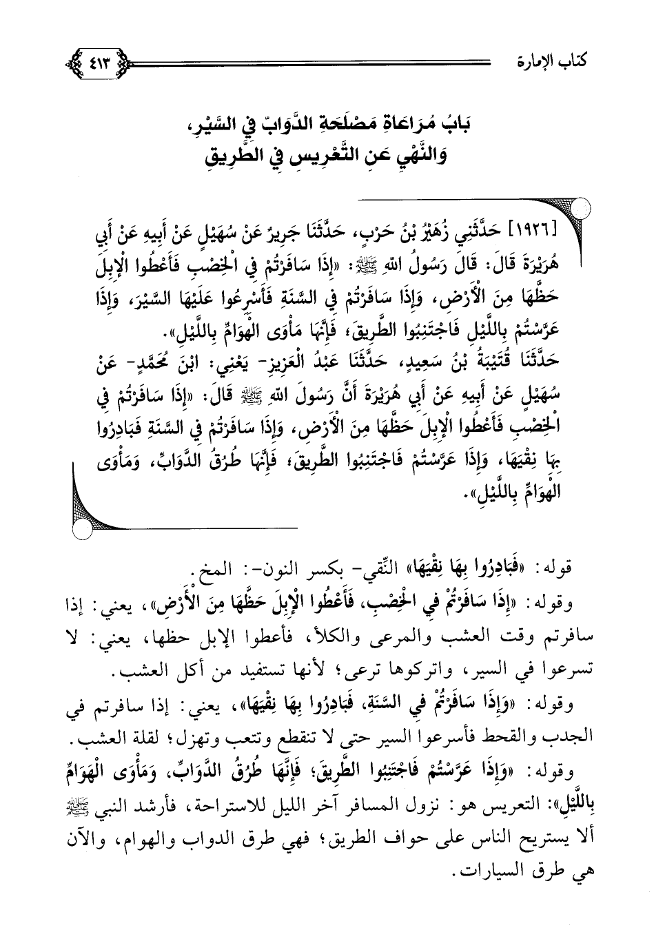 [١٩٢٦] حَدَّثَنِي زُهَيْرُ بْنُ حَرْبٍ، حَدَّثَنَا جَرِيرٌ عَنْ سُهَيْلٍ عَنْ أَبِيهِ عَنْ أَبِي هُرَيْرَةَ قَالَ: قَالَ رَسُولُ اللهِ صلى الله عليه وسلم: ((إِذَا سَافَرْتُمْ فِي الْخِصْبِ فَأَعْطُوا الْإِبِلَ حَظَّهَا مِنَ الْأَرْضِ، وَإِذَا سَافَرْتُمْ فِي السَّنَةِ فَأَسْرِعُوا عَلَيْهَا السَّيْرَ، وَإِذَا عَرَّسْتُمْ بِاللَّيْلِ فَاجْتَنِبُوا الطَّرِيقَ؛ فَإِنَّهَا مَأْوَى الْهَوَامِّ بِاللَّيْلِ)).
