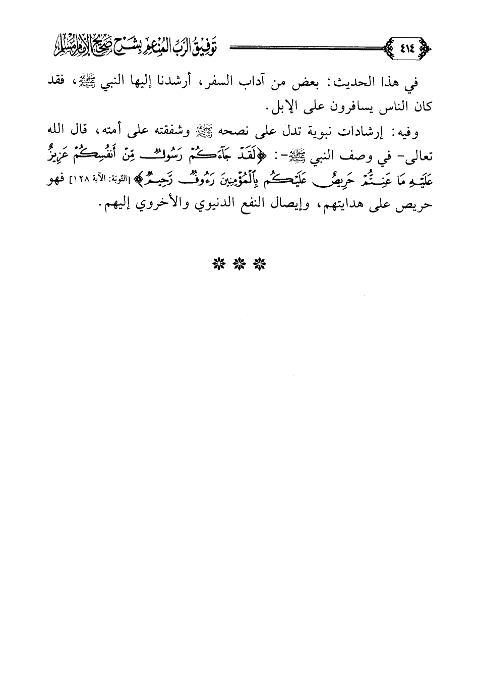 وفيه: إرشادات نبوية تدل على نصحه عليه الصلاة والسلام وشفقته على أمته، قال الله تعالى- في وصف النبي صلى الله عليه وسلم-: {لَقَدْ جَاءَكُمْ رَسُولٌ مِنْ أَنْفُسِكُمْ عَزِيزٌ عَلَيْهِ مَا عَنِتُّمْ حَرِيصٌ عَلَيْكُمْ بِالْمُؤْمِنِينَ رَءُوفٌ رَحِيمٌ} فهو حريص على هدايتهم، وإيصال النفع الدنيوي والأخروي إليهم.