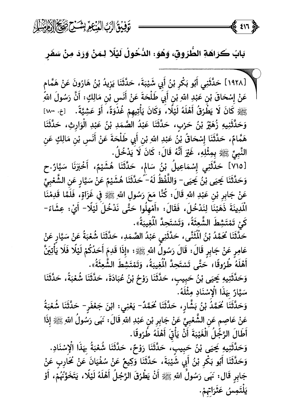 [١٩٢٨] حَدَّثَنِي أَبُو بَكْرِ بْنُ أَبِي شَيْبَةَ، حَدَّثَنَا يَزِيدُ بْنُ هَارُونَ عَنْ هَمَّامٍ عَنْ إِسْحَاقَ بْنِ عَبْدِ اللهِ بْنِ أَبِي طَلْحَةَ عَنْ أَنَسِ بْنِ مَالِكٍ: أَنّ رَسُولَ اللهِ صلى الله عليه وسلم كَانَ لَا يَطْرُقُ أَهْلَهُ لَيْلًا، وَكَانَ يَأْتِيهِمْ غُدْوَةً، أَوْ عَشِيَّةً.
