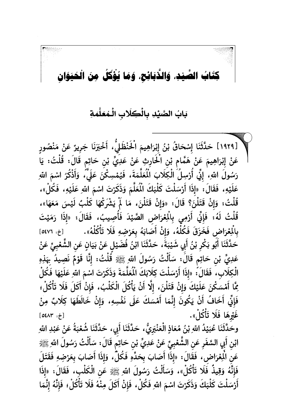 [١٩٢٩] حَدَّثَنَا إِسْحَاقُ بْنُ إِبْرَاهِيمَ الْحَنْظَلِيُّ، أَخْبَرَنَا جَرِيرٌ عَنْ مَنْصُورٍ عَنْ إِبْرَاهِيمَ عَنْ هَمَّامِ بْنِ الْحَارِثِ عَنْ عَدِيِّ بْنِ حَاتِمٍ قَالَ: قُلْتُ: يَا رَسُولَ اللهِ، إِنِّي أُرْسِلُ الْكِلَابَ الْمُعَلَّمَةَ، فَيُمْسِكْنَ عَلَيَّ، وَأَذْكُرُ اسْمَ اللهِ عَلَيْهِ، فَقَالَ: ((إِذَا أَرْسَلْتَ كَلْبَكَ الْمُعَلَّمَ وَذَكَرْتَ اسْمَ اللهِ عَلَيْهِ، فَكُلْ))، قُلْتُ: وَإِنْ قَتَلْنَ؟ قَالَ: ((وَإِنْ قَتَلْنَ، مَا لَمْ يَشْرَكْهَا كَلْبٌ لَيْسَ مَعَهَا))، قُلْتُ لَهُ: فَإِنِّي أَرْمِي بِالْمِعْرَاضِ الصَّيْدَ فَأُصِيبُ، فَقَالَ: ((إِذَا رَمَيْتَ بِالْمِعْرَاضِ فَخَزَقَ فَكُلْهُ، وَإِنْ أَصَابَهُ بِعَرْضِهِ فَلَا تَأْكُلْهُ)).