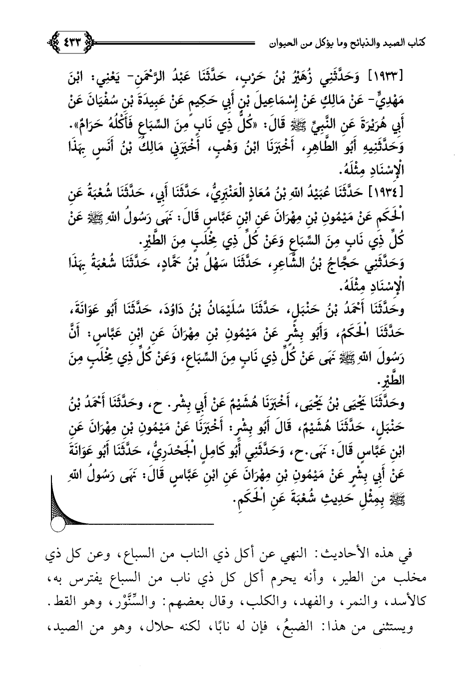 [١٩٣٣] وَحَدَّثَنِي زُهَيْرُ بْنُ حَرْبٍ، حَدَّثَنَا عَبْدُ الرَّحْمَنِ- يَعْنِي: ابْنَ مَهْدِيٍّ- عَنْ مَالِكٍ عَنْ إِسْمَاعِيلَ بْنِ أَبِي حَكِيمٍ عَنْ عَبِيدَةَ بْنِ سُفْيَانَ عَنْ أَبِي هُرَيْرَةَ عَنِ النَّبِيِّ صلى الله عليه وسلم قَالَ: ((كُلُّ ذِي نَابٍ مِنَ السِّبَاعِ فَأَكْلُهُ حَرَامٌ)).
