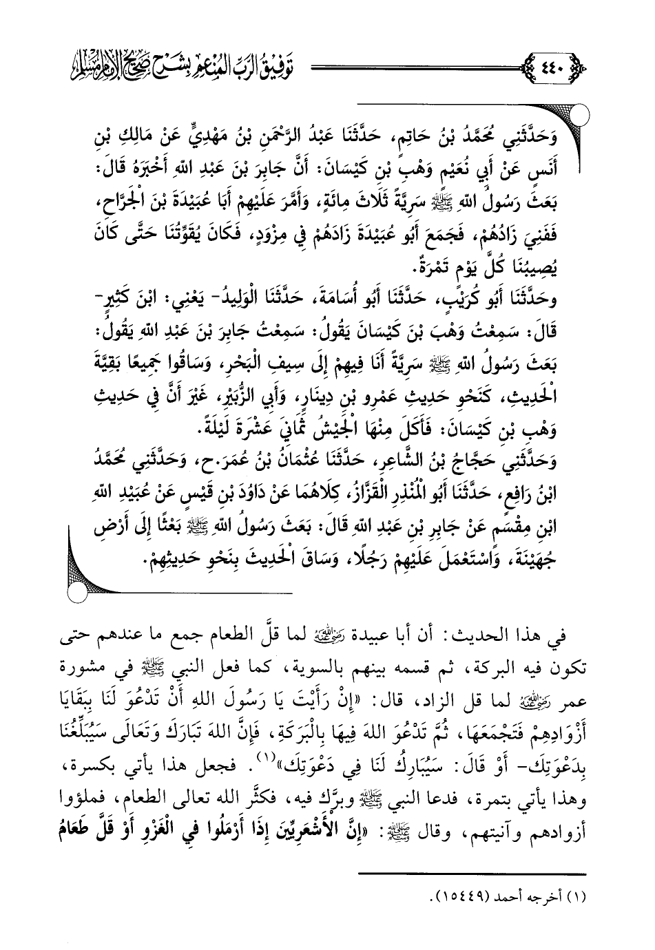 وَحَدَّثَنِي مُحَمَّدُ بْنُ حَاتِمٍ، حَدَّثَنَا عَبْدُ الرَّحْمَنِ بْنُ مَهْدِيٍّ عَنْ مَالِكِ بْنِ أَنَسٍ عَنْ أَبِي نُعَيْمٍ وَهْبِ بْنِ كَيْسَانَ: أَنَّ جَابِرَ بْنَ عَبْدِ اللهِ أَخْبَرَهُ قَالَ: بَعَثَ رَسُولُ اللهِ صلى الله عليه وسلم سَرِيَّةً ثَلَاثَ مِائَةٍ، وَأَمَّرَ عَلَيْهِمْ أَبَا عُبَيْدَةَ بْنَ الْجَرَّاحِ، فَفَنِيَ زَادُهُمْ، فَجَمَعَ أَبُو عُبَيْدَةَ زَادَهُمْ فِي مِزْوَدٍ، فَكَانَ يُقَوِّتُنَا حَتَّى كَانَ يُصِيبُنَا كُلَّ يَوْمٍ تَمْرَةٌ.