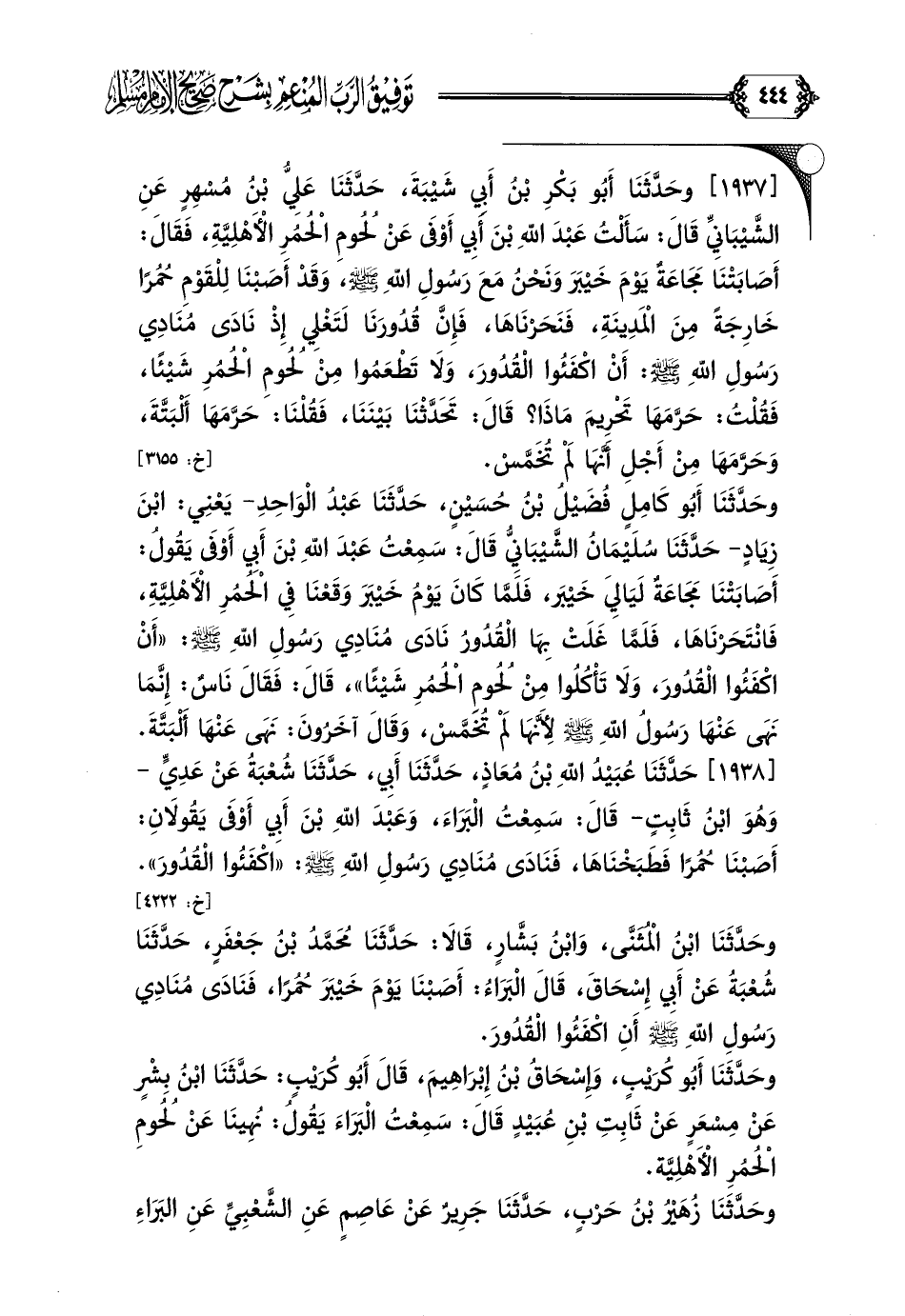 [١٩٣٧] وحَدَّثَنَا أَبُو بَكْرِ بْنُ أَبِي شَيْبَةَ، حَدَّثَنَا عَلِيُّ بْنُ مُسْهِرٍ عَنِ الشَّيْبَانِيِّ قَالَ: سَأَلْتُ عَبْدَ اللهِ بْنَ أَبِي أَوْفَى عَنْ لُحُومِ الْحُمُرِ الْأَهْلِيَّةِ، فَقَالَ: أَصَابَتْنَا مَجَاعَةٌ يَوْمَ خَيْبَرَ وَنَحْنُ مَعَ رَسُولِ اللهِ صلى الله عليه وسلم، وَقَدْ أَصَبْنَا لِلْقَوْمِ حُمُرًا خَارِجَةً مِنْ الْمَدِينَةِ، فَنَحَرْنَاهَا، فَإِنَّ قُدُورَنَا لَتَغْلِي إِذْ نَادَى مُنَادِي رَسُولِ اللهِ صلى الله عليه وسلم: أَنْ اكْفَئُوا الْقُدُورَ، وَلَا تَطْعَمُوا مِنْ لُحُومِ الْحُمُرِ شَيْئًا، فَقُلْتُ: حَرَّمَهَا تَحْرِيمَ مَاذَا؟ قَالَ: تَحَدَّثْنَا بَيْنَنَا، فَقُلْنَا: حَرَّمَهَا أَلْبَتَّةَ، وَحَرَّمَهَا مِنْ أَجْلِ أَنَّهَا لَمْ تُخَمَّسْ.