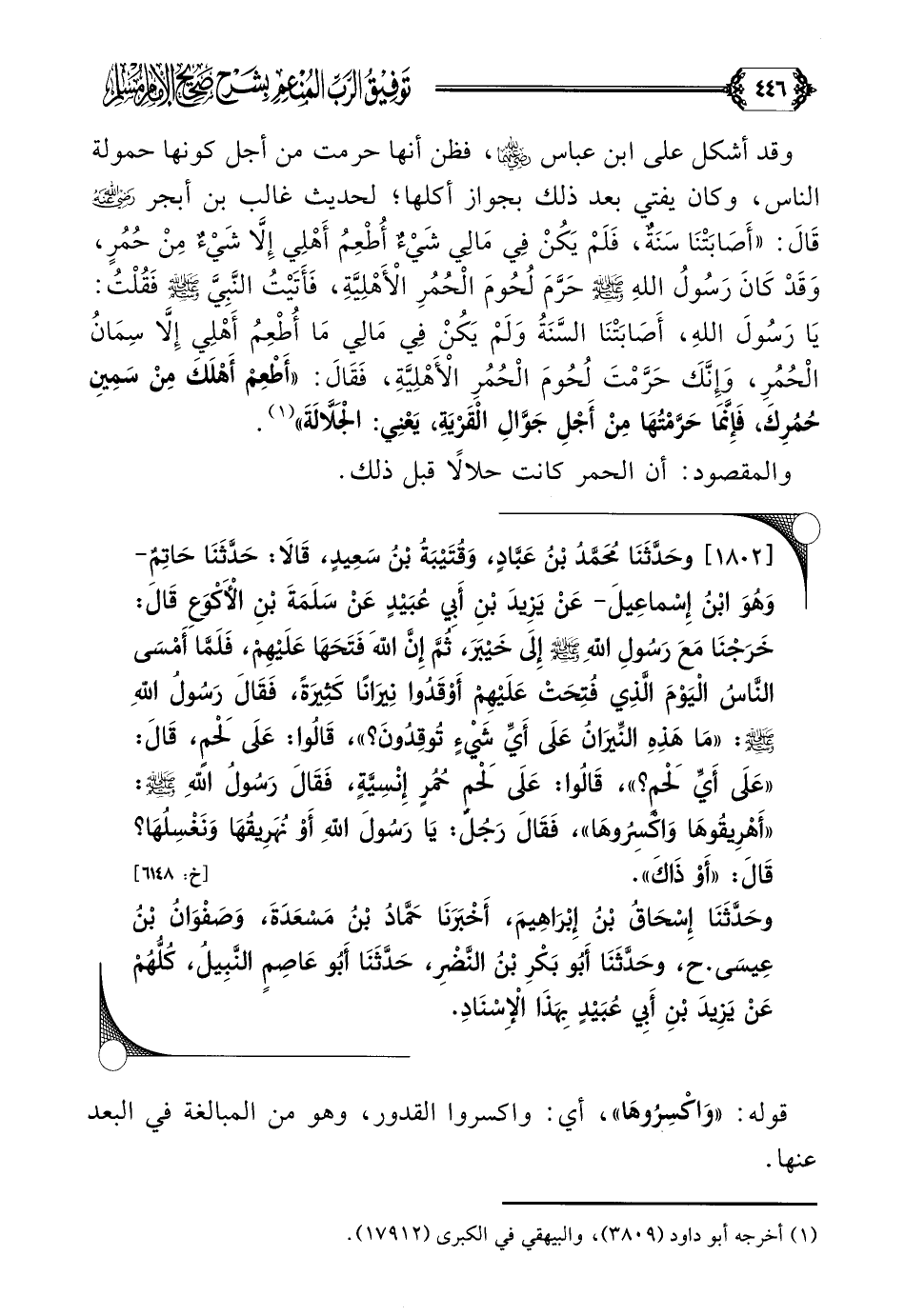 [١٨٠٢] وحَدَّثَنَا مُحَمَّدُ بْنُ عَبَّادٍ، وَقُتَيْبَةُ بْنُ سَعِيدٍ، قَالَا: حَدَّثَنَا حَاتِمٌ- وَهُوَ ابْنُ إِسْماعِيلَ- عَنْ يَزِيدَ بْنِ أَبِي عُبَيْدٍ عَنْ سَلَمَةَ بْنِ الْأَكْوَعِ قَالَ: خَرَجْنَا مَعَ رَسُولِ اللهِ صلى الله عليه وسلم إِلَى خَيْبَرَ، ثُمَّ إِنَّ اللهَ فَتَحَهَا عَلَيْهِمْ، فَلَمَّا أَمْسَى النَّاسُ الْيَوْمَ الَّذِي فُتِحَتْ عَلَيْهِمْ أَوْقَدُوا نِيرَانًا كَثِيرَةً، فَقَالَ رَسُولُ اللهِ صلى الله عليه وسلم: ((مَا هَذِهِ النِّيرَانُ عَلَى أَيِّ شَيْءٍ تُوقِدُونَ؟ ))، قَالُوا: عَلَى لَحْمٍ، قَالَ: ((عَلَى أَيِّ لَحْمٍ؟ ))، قَالُوا: عَلَى لَحْمِ حُمُرٍ إِنْسِيَّةٍ، فَقَالَ رَسُولُ اللهِ صلى الله عليه وسلم: ((أَهْرِيقُوهَا وَاكْسِرُوهَا))، فَقَالَ رَجُلٌ: يَا رَسُولَ اللهِ أَوْ نُهَرِيقُهَا وَنَغْسِلُهَا؟ قَالَ: ((أَوْ ذَاكَ)).