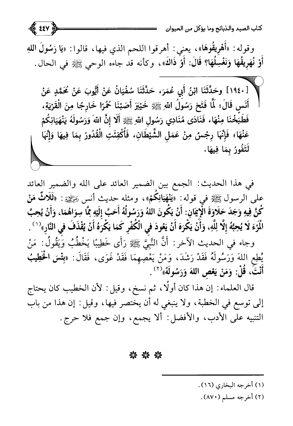 و ((أَهْرِيقُوهَا))، يعني: أهرقوا اللحم الذي فيها، قالوا: ((يَا رَسُولَ اللهِ أَوْ نُهَرِيقُهَا وَنَغْسِلُهَا؟ قَالَ: أَوْ ذَاكَ))، وكأنه قد جاءه الوحي صلى الله عليه وسلم في الحال.
