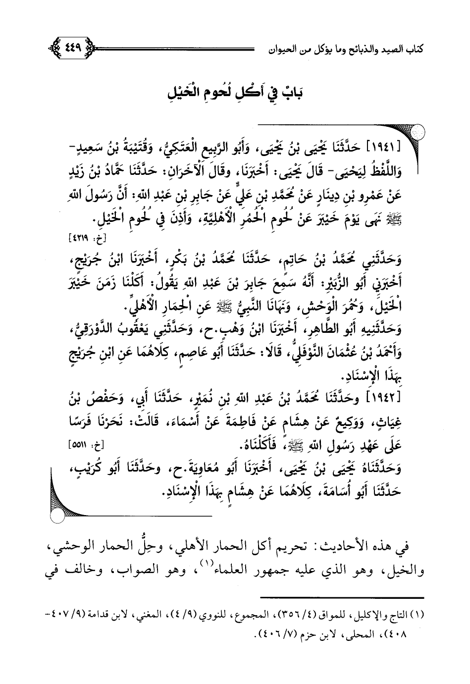 [١٩٤١] حَدَّثَنَا يَحْيَى بْنُ يَحْيَى، وَأَبُو الرَّبِيعِ الْعَتَكِيُّ، وَقُتَيْبَةُ ابْنُ سَعِيدٍ- وَاللَّفْظُ لِيَحْيَى- قَالَ يَحْيَى: أَخْبَرَنَا، وقَالَ الْآخَرَانِ: حَدَّثَنَا حَمَّادُ بْنُ زَيْدٍ عَنْ عَمْرِو بْنِ دِينَارٍ عَنْ مُحَمَّدِ بْنِ عَلِيٍّ عَنْ جَابِرِ بْنِ عَبْدِ اللهِ: أَنَّ رَسُولَ اللهِ صلى الله عليه وسلم نَهَى يَوْمَ خَيْبَرَ عَنْ لُحُومِ الْحُمُرِ الْأَهْلِيَّةِ، وَأَذِنَ فِي لُحُومِ الْخَيْلِ.