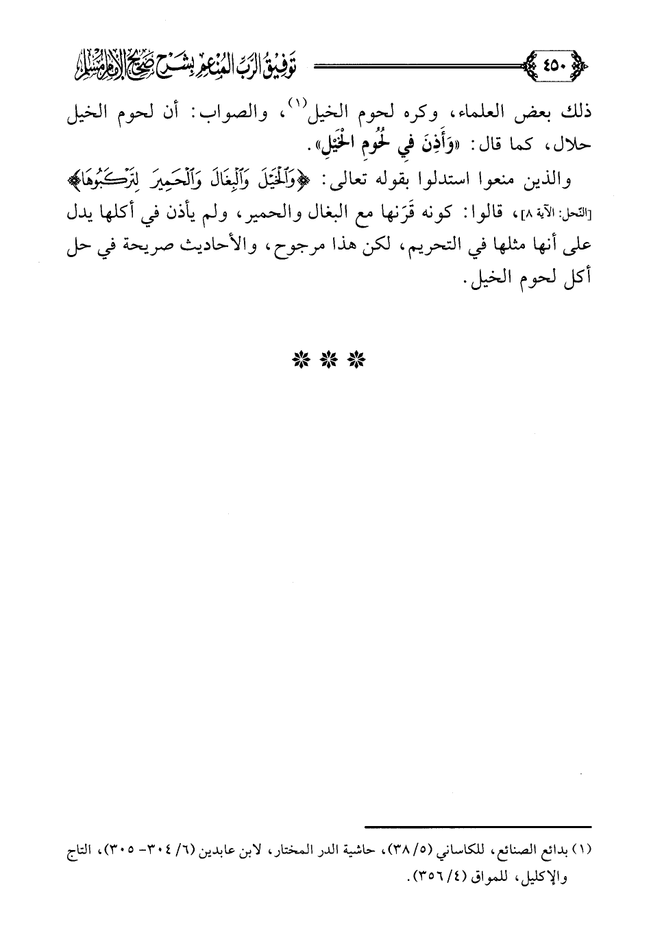 ذلك بعض العلماء، وكره لحوم الخيل (¬١)، والصواب: أن لحوم الخيل حلال، كما قال: ((وَأَذِنَ فِي لُحُومِ الْخَيْلِ)).