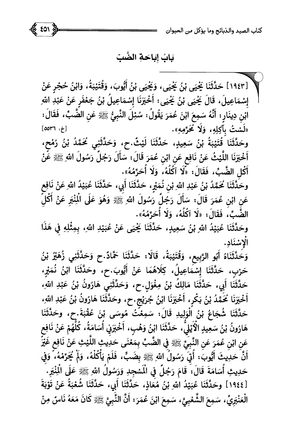 وحَدَّثَنَا قُتَيْبَةُ بْنُ سَعِيدٍ، حَدَّثَنَا لَيْثٌ. ح، وَحَدَّثَنِي مُحَمَّدُ بْنُ رُمْحٍ، أَخْبَرَنَا اللَّيْثُ عَنْ نَافِعٍ عَنِ ابْنِ عُمَرَ قَالَ: سَأَلَ رَجُلٌ رَسُولَ اللهِ صلى الله عليه وسلم عَنْ أَكْلِ الضَّبِّ، فَقَالَ: ((لَا آكُلُهُ، وَلَا أُحَرِّمُهُ)).