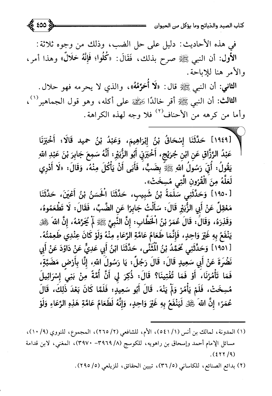 [١٩٤٩] حَدَّثَنَا إِسْحَاقُ بْنُ إِبْرَاهِيمَ، وَعَبْدُ بْنُ حميد قَالَا: أَخْبَرَنَا عَبْدُ الرَّزَّاقِ عَنِ ابْنِ جُرَيْجٍ، أَخْبَرَنِي أَبُو الزُّبَيْرِ: أَنَّهُ سَمِعَ جَابِرَ بْنَ عَبْدِ اللهِ يَقُولُ: أُتِيَ رَسُولُ اللهِ صلى الله عليه وسلم بِضَبٍّ، فَأَبَى أَنْ يَأْكُلَ مِنْهُ، وَقَالَ: ((لَا أَدْرِي لَعَلَّهُ مِنَ الْقُرُونِ الَّتِي مُسِخَتْ)).