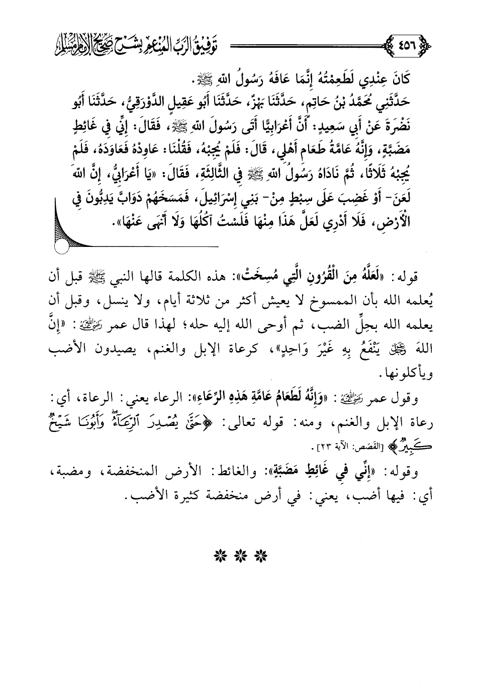 قوله: ((لَعَلَّهُ مِنَ الْقُرُونِ الَّتِي مُسِخَتْ)) هذه الكلمة قالها النبي صلى الله عليه وسلم قبل أن يُعلمه الله بأن الممسوخ لا يعيش أكثر من ثلاثة أيام، ولا ينسل، وقبل أن يعلمه الله بحِلِّ الضب، ثم أوحى الله إليه حله؛ لهذا قال عمر رضي الله عنه: ((إِنَّ اللهَ عز وجل يَنْفَعُ بِهِ غَيْرَ وَاحِدٍ))، كرعاة الإبل والغنم، يصيدون الأضب ويأكلونها.