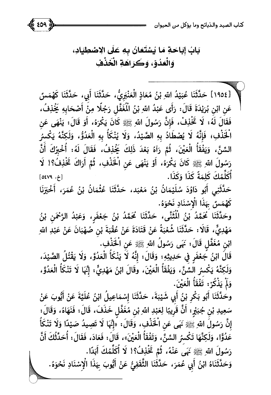 وحَدَّثَنَا أَبُو بَكْرِ بْنُ أَبِي شَيْبَةَ، حَدَّثَنَا إِسْمَاعِيلُ ابْنُ عُلَيَّةَ عَنْ أَيُّوبَ عَنْ سَعِيدِ بْنِ جُبَيْرٍ: أَنَّ قَرِيبًا لِعَبْدِ اللهِ بْنِ مُغَفَّلٍ خَذَفَ، قَالَ: فَنَهَاهُ، وَقَالَ: إِنَّ رَسُولَ اللهِ صلى الله عليه وسلم نَهَى عَنِ الْخَذْفِ، وَقَالَ: ((إِنَّهَا لَا تَصِيدُ صَيْدًا وَلَا تَنْكَأُ عَدُوًّا، وَلَكِنَّهَا تَكْسِرُ السِّنَّ، وَتَفْقَأُ الْعَيْنَ))، قَالَ: فَعَادَ، فَقَالَ: أُحَدِّثُكَ أَنَّ رَسُولَ اللهِ صلى الله عليه وسلم نَهَى عَنْهُ، ثُمَّ تَخْذِفُ؟ ! لَا أُكَلِّمُكَ أَبَدًا.