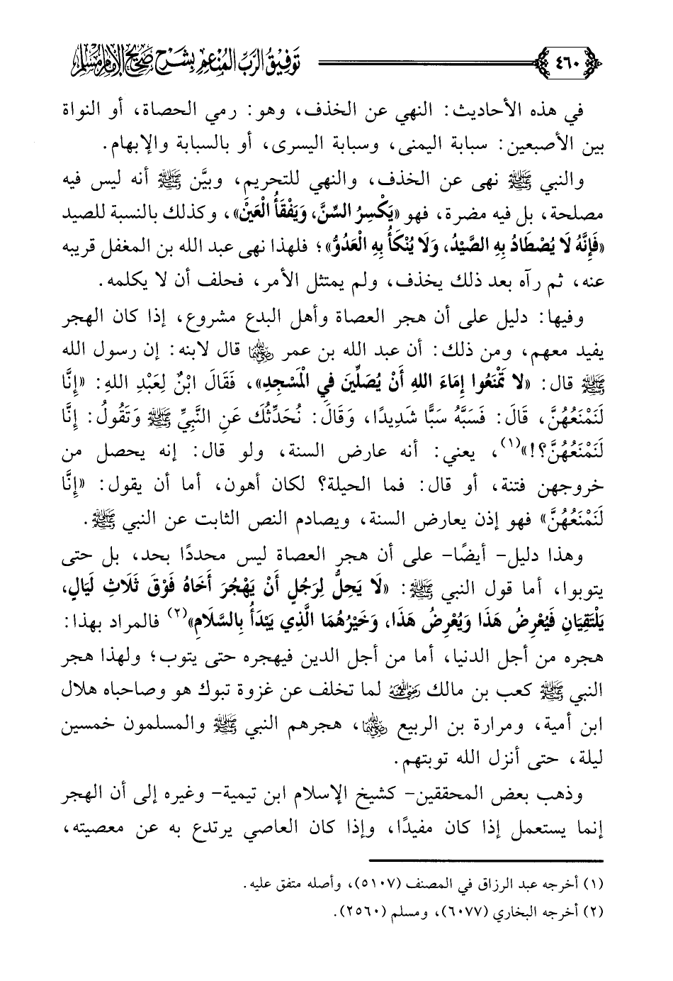وفيها: دليل على أن هجر العصاة وأهل البدع مشروع، إذا كان الهجر يفيد معهم، ومن ذلك أن عبد الله بن عمر رضي الله عنهما قال لابنه: إن رسول الله صلى الله عليه وسلم قال: ((لا تَمْنَعُوا إِمَاءَ اللهِ أَنْ يُصَلِّينَ فِي الْمَسْجِدِ))، فَقَالَ ابْنٌ لِعَبْدِ اللهِ: ((إِنَّا لَنَمْنَعُهُنَّ، قَالَ: فَسَبَّهُ سَبًّا شَدِيدًا، وَقَالَ: نُحَدِّثُكَ عَنِ النَّبِيِّ صلى الله عليه وسلم وَتَقُولُ: إِنَّا لَنَمْنَعُهُنَّ؟ ! )) (¬١)، يعني: أنه عارض السنة، ولو قال: إنه يحصل من خروجهن فتنة، أو قال: فما الحيلة؟ لكان أهون، أما أن يقول: ((إِنَّا لَنَمْنَعُهُنَّ)) فهو إذن يعارض السنة، ويصادم النص الثابت عن النبي صلى الله عليه وسلم.