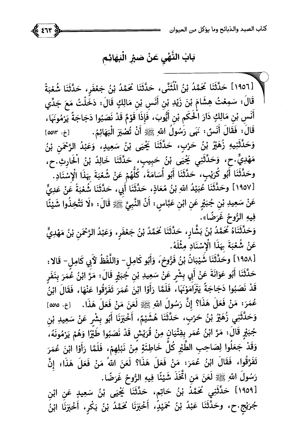 [١٩٥٦] حَدَّثَنَا مُحَمَّدُ بْنُ الْمُثَنَّى، حَدَّثَنَا مُحَمَّدُ بْنُ جَعْفَرٍ، حَدَّثَنَا شُعْبَةُ قَالَ: سَمِعْتُ هِشَامَ بْنَ زَيْدِ بْنِ أَنَسِ بْنِ مَالِكٍ قَالَ: دَخَلْتُ مَعَ جَدِّي أَنَسِ بْنِ مَالِكٍ دَارَ الْحَكَمِ بْنِ أَيُّوبَ، فَإِذَا قَوْمٌ قَدْ نَصَبُوا دَجَاجَةً يَرْمُونَهَا، قَالَ: فَقَالَ أَنَسٌ: نَهَى رَسُولُ اللهِ صلى الله عليه وسلم أَنْ تُصْبَرَ الْبَهَائِمُ.
