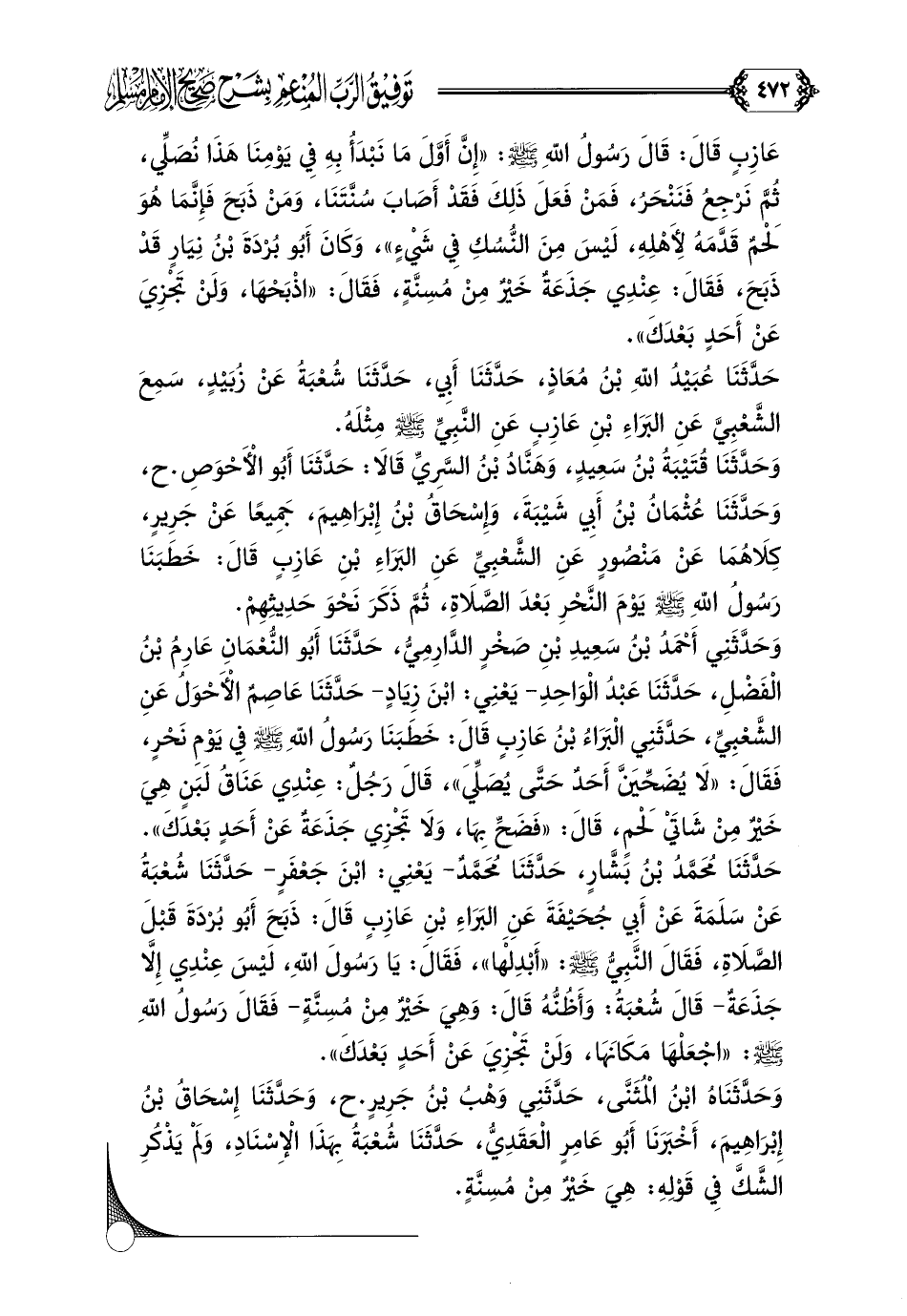 عَازِبٍ قَالَ: قَالَ رَسُولُ اللَّهِ صلى الله عليه وسلم: ((إِنَّ أَوَّلَ مَا نَبْدَأُ بِهِ فِي يَوْمِنَا هَذَا نُصَلِّي، ثُمَّ نَرْجِعُ فَنَنْحَرُ، فَمَنْ فَعَلَ ذَلِكَ فَقَدْ أَصَابَ سُنَّتَنَا، وَمَنْ ذَبَحَ فَإِنَّمَا هُوَ لَحْمٌ قَدَّمَهُ لِأَهْلِهِ، لَيْسَ مِنَ النُّسُكِ فِي شَيْءٍ))، وَكَانَ أَبُو بُرْدَةَ بْنُ نِيَارٍ قَدْ ذَبَحَ، فَقَالَ: عِنْدِي جَذَعَةٌ خَيْرٌ مِنْ مُسِنَّةٍ، فَقَالَ: ((اذْبَحْهَا، وَلَنْ تَجْزِيَ عَنْ أَحَدٍ بَعْدَكَ)).