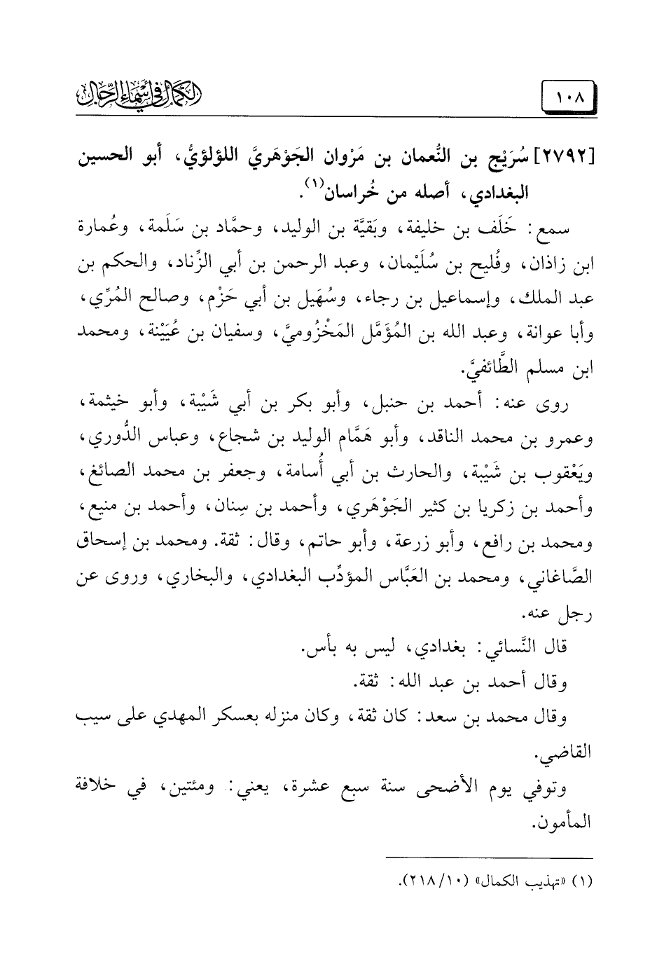 [٢٧٩٢] سُرَيْج بن النُّعمان بن مَرْوان الجَوْهَريَّ اللؤلؤيّ، أبو الحسين البغدادي، أصله من خراسان (¬١).