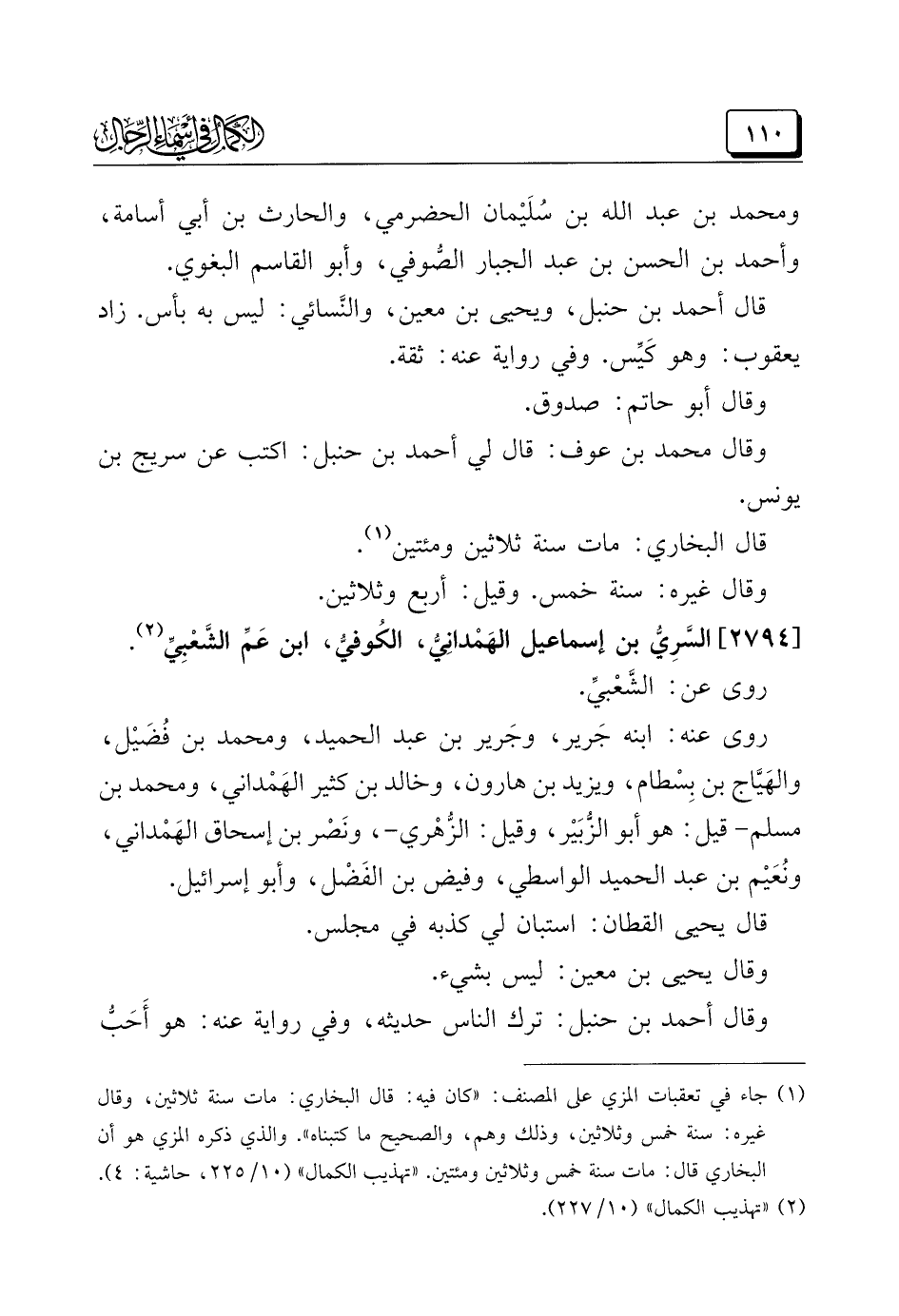 (¬١) جاء في تعقبات المزي على المصنف: "كان فيه: قال البخاري: مات سنة ثلاثين، وقال غيره: سنة خمس وثلاثين، وذلك وهم، والصحيح ما كتبناه". والذي ذكره المزي هو أن البخاري قال: مات سنة خمس وثلاثين ومئتين، "تهذيب الكمال" (١٠/ ٢٢٥، حاشية: ٤).