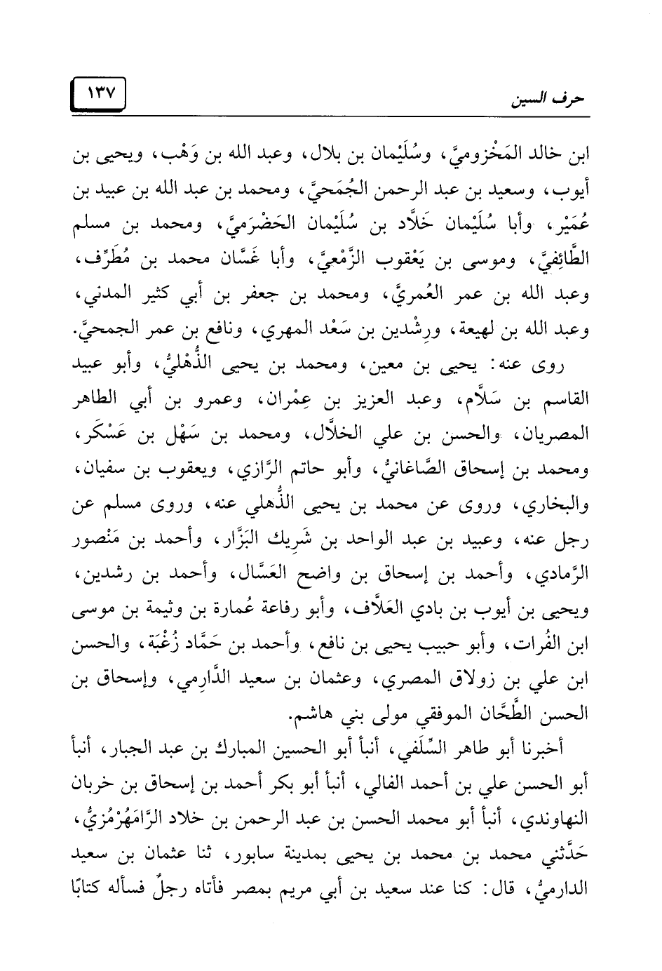 أخبرنا أبو طاهر السِّلَفي، أنبأ أبو الحسين المبارك بن عبد الجبار، أنبأ أبو الحسن علي بن أحمد الفالي، أنبأ أبو بكر أحمد بن إسحاق بن خربان النهاوندي، أنبأ أبو محمد الحسن بن عبد الرحمن بن خلاد الرَّامَهُرْمُزيُّ، حَدَّثني محمد بن محمد بن يحيى بمدينة سابور، ثنا عثمان بن سعيد الدارميُّ، قال: كنا عند سعيد بن أبي مريم بمصر فأتاه رجلٌ فسأله كتابًا