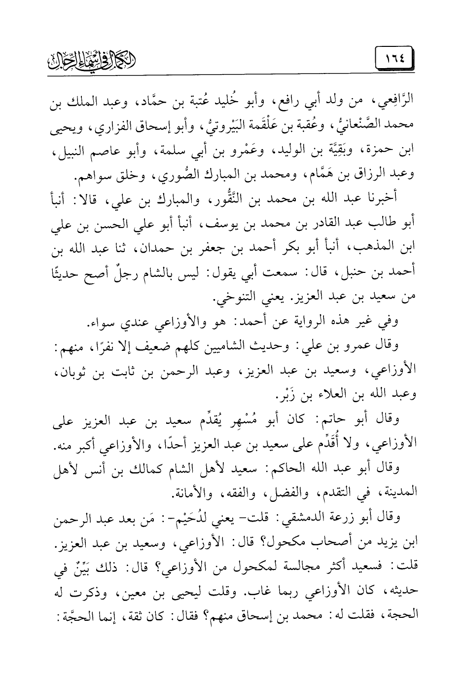 وفي غير هذه الرواية عن أحمد: هو والأوزاعي عندي سواء. وقال عمرو بن علي: وحديث الشاميين كلهم ضعيف إلا نفرًا، منهم: الأوزاعي، وسعيد بن عبد العزيز، وعبد الرحمن بن ثابت بن ثوبان، وعبد الله بن العلاء بن زَبْر.