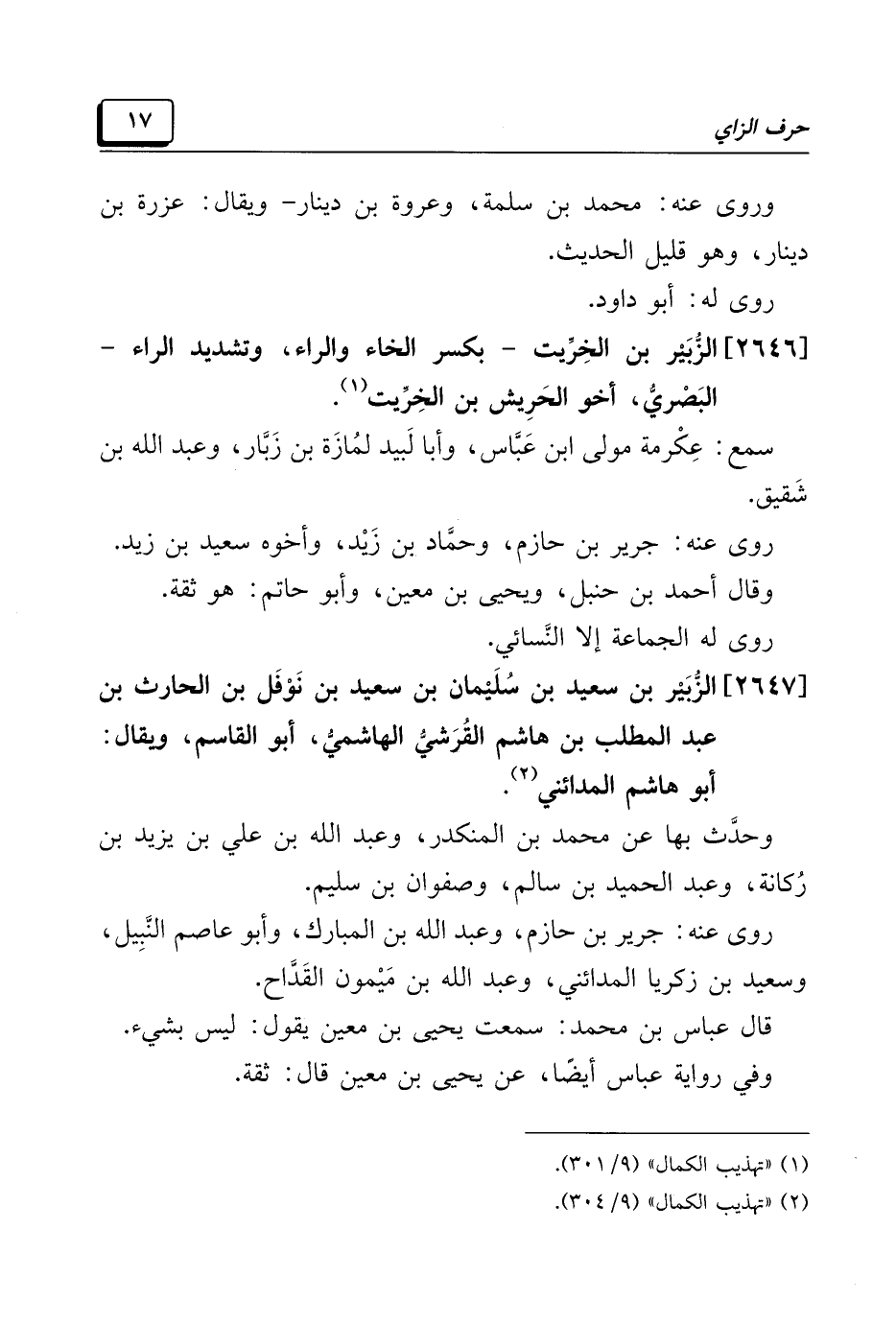[٢٦٤٦] الزُّبَيْر بن الخِرِّيت -بكسر الخاء والراء، وتشديد الراء- البَصْريُّ، أخو الحَرِيش بن الخِرِّيت (¬١).