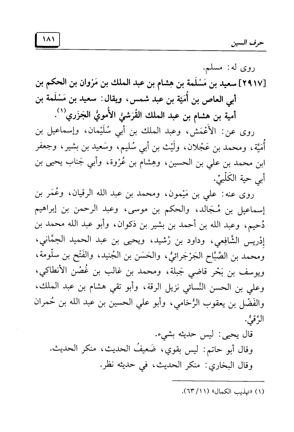 [٢٩١٧] سعيد بن مَسْلَمَة بن هشام بن عبد الملك بن مَرْوان بن الحكم بن أبي العاص بن أُمَيَّة بن عبد شمس، ويقال: سعيد بن مَسْلَمَة بن أمية بن هشام بن عبد الملك القُرَشِيُّ الأُمويُّ الجَزَري (¬١).