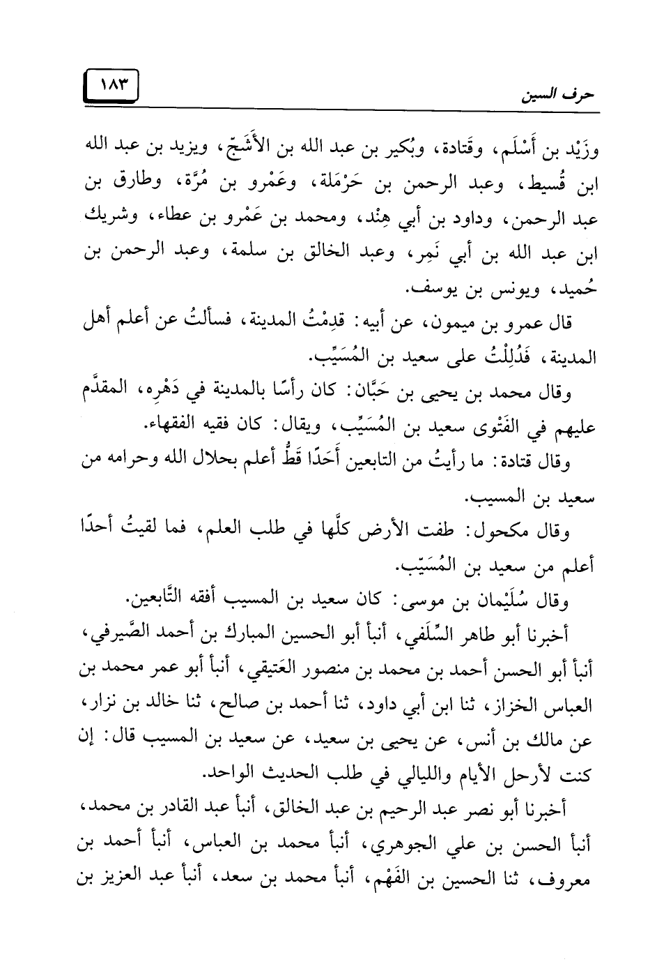 أخبرنا أبو طاهر السِّلَفِي، أنبأ أبو الحسين المُبَارَك بن أحمد الصَّيْرَفي، أنبأ أبو الحسن أحمد بن محمد بن منصور العَتيقي، أنبأ أبو عمر محمد بن العبَّاس الخزاز، ثنا ابن أبي داود، ثنا أحمد بن صالح، ثنا خَالد بن نزار، عن مالك بن أنس، عن يحيى بن سعيد، عن سعيد بن المسيّب قال: إن كنت لأرحل الأيام والليالي في طلب الحديث الواحد.